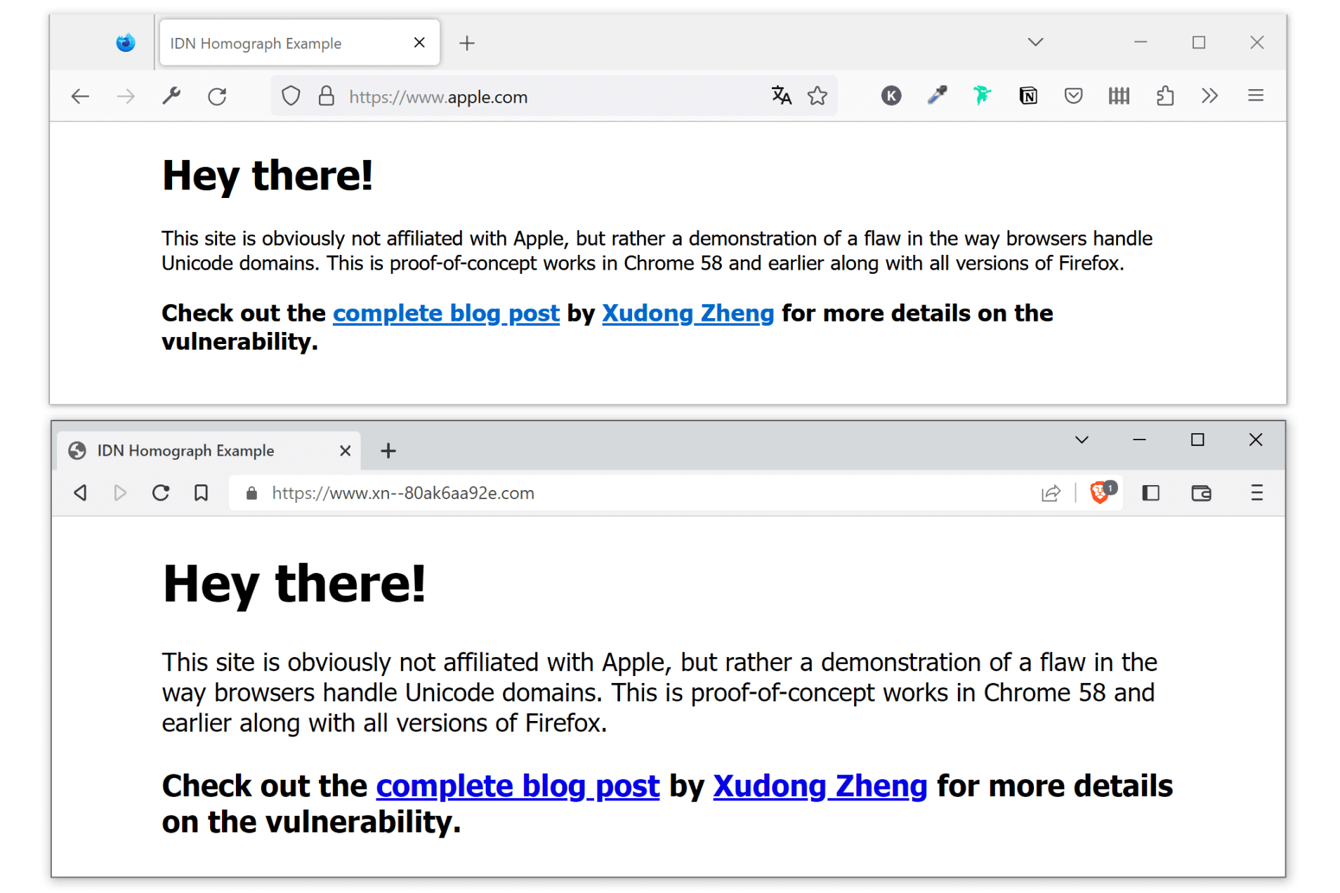Сайт www.аррӏе.com с кириллической «а» в адресе в браузерах Mozilla Firefox (сверху) и Brave (снизу) — обратите внимание на строку адреса