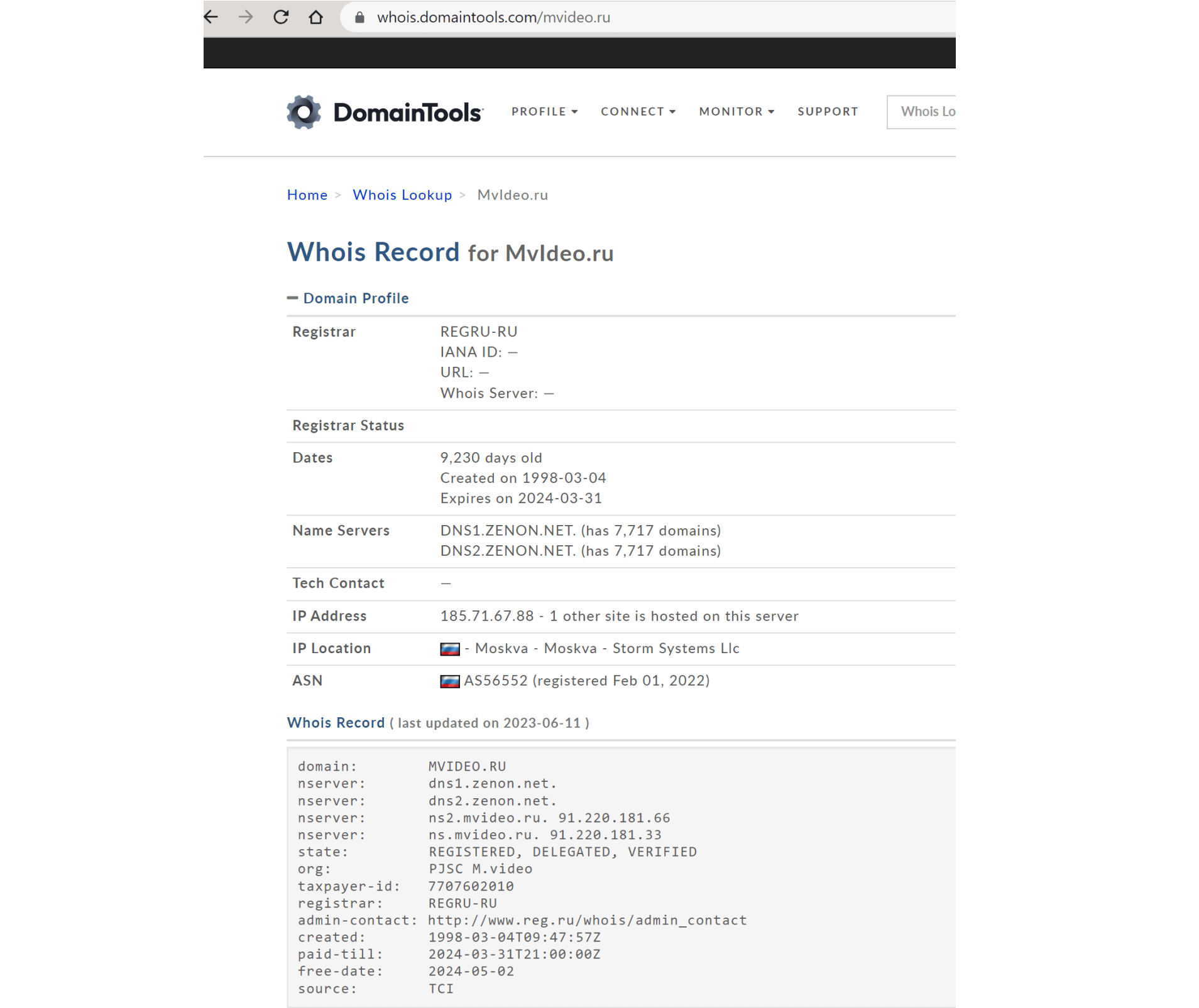 Для проверки можно воспользоваться сервисом DomainTools или аналогичным сервисом Whois от регистратора доменных имен. Вывод утилиты Whois показывает, к примеру, что домен mvideo.ru был зарегистрирован в 1998 году и принадлежит юридическому лицу PJSC M.video