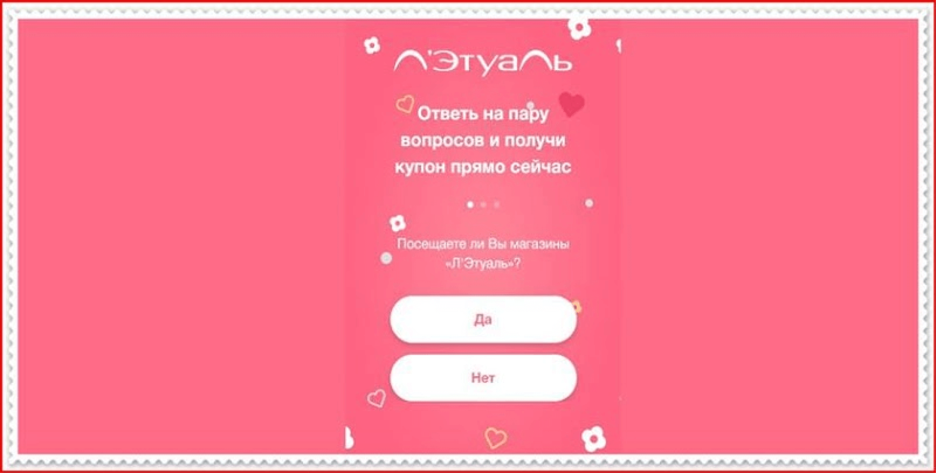 По социальным сетям и в мессенджерах рассылают сообщение, например: «Подарок к 8 Марта уже ждет вас! Уникальный купон на сумму до 8 888 руб. от ''Л'Этуаль''». Сообщение нужно разослать не менее чем пяти друзьям, а потом перейти по ссылке на страницу поддельного сайта и там для получения подарка принять участие в опросе: