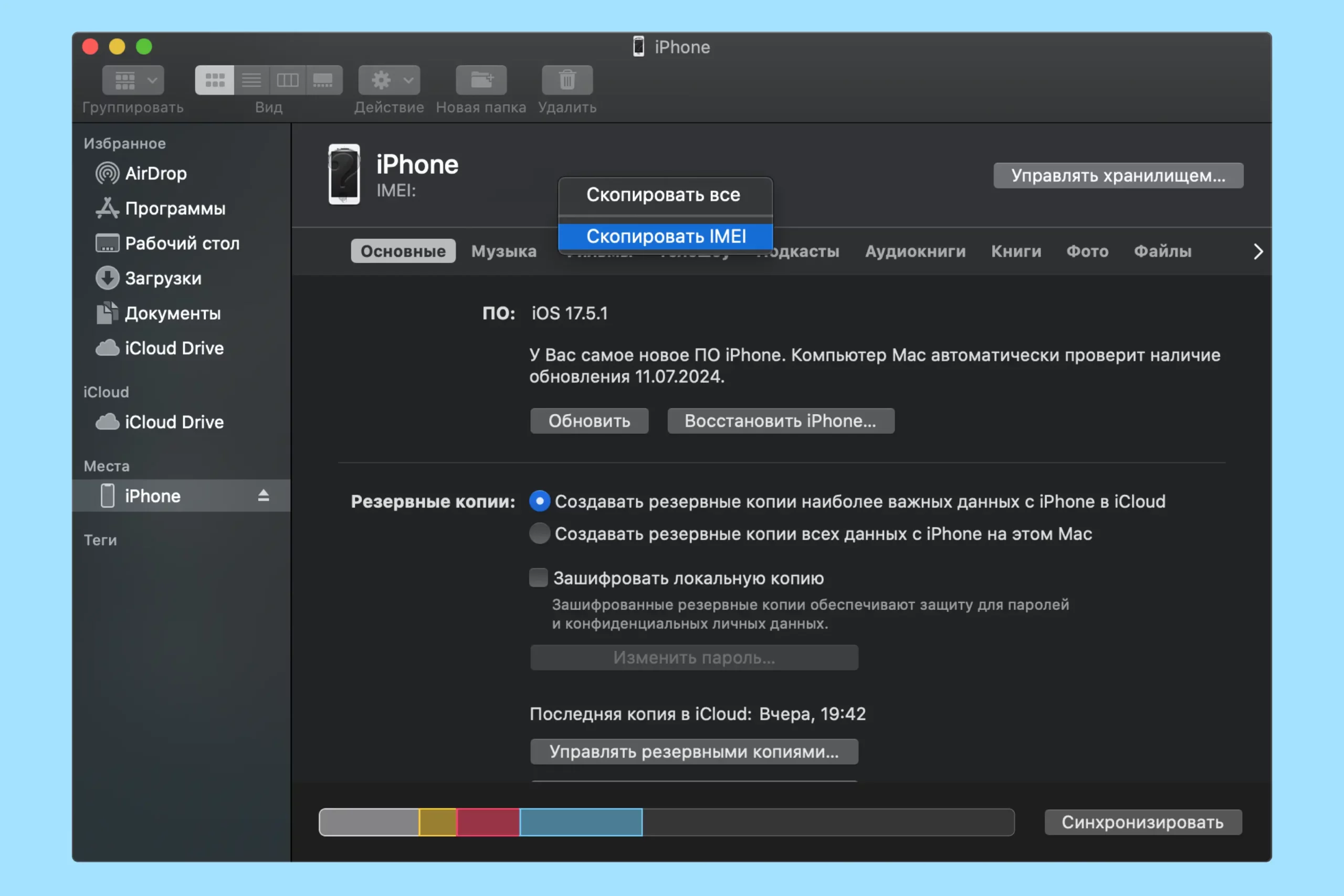 - Подключите iPhone к компьютеру. Если вы используете Mac, то вам потребуется открыть Finder. Для Windows — iTunes.