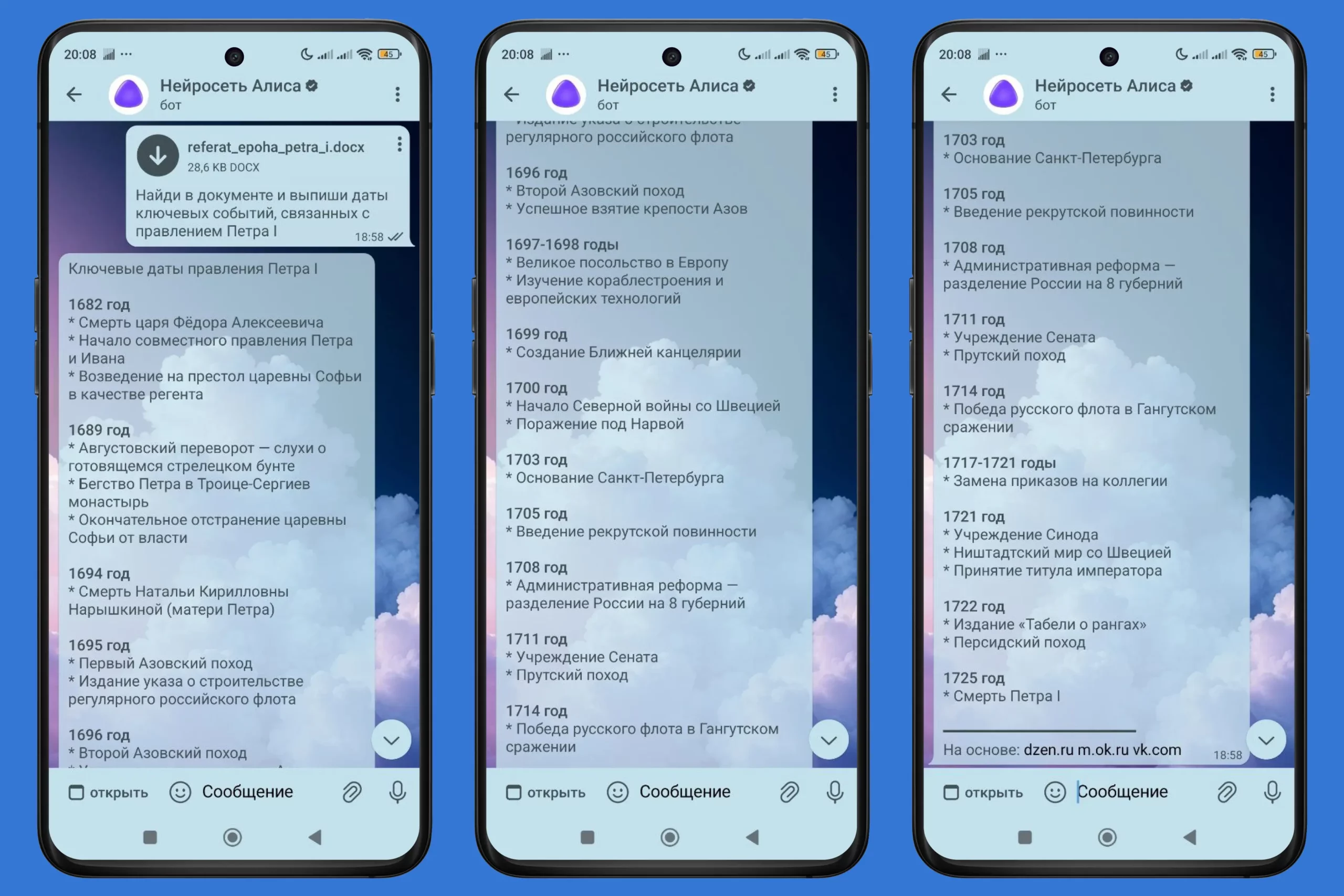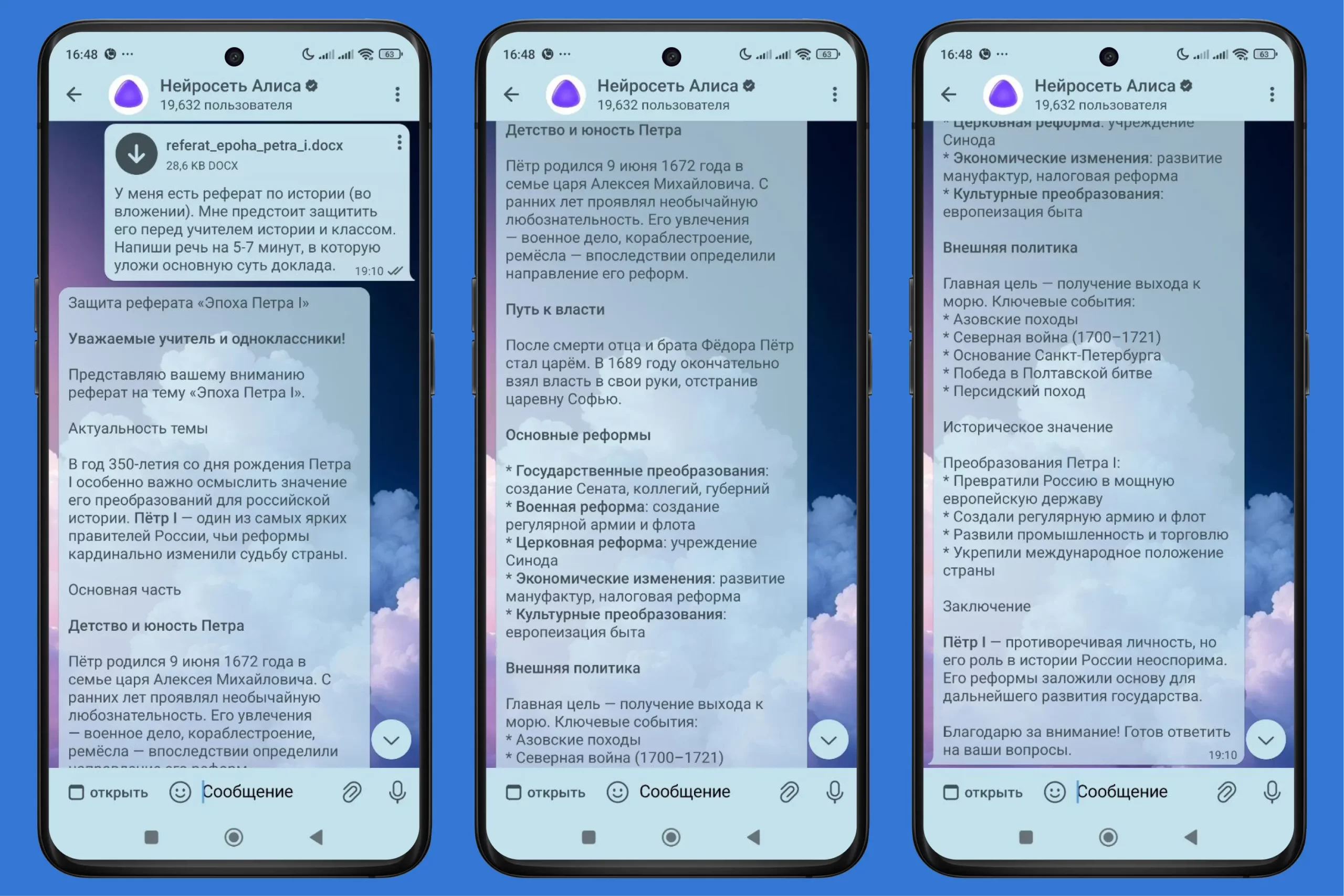 Проверим, насколько хороший секретарь получится из Telegram-бота с Алисой. Загрузим документ и поработаем с ним. За основу берем реферат по эпохе Петра I, который нашли в публичном доступе.