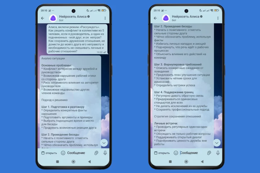 Алиса разбила вопрос на части, выделила проблемы, дала пошаговые советы по урегулированию конфликта в моменте, поддержанию отношений с другом-коллегой и профилактикой будущих проблем. Вполне структурно и логично.