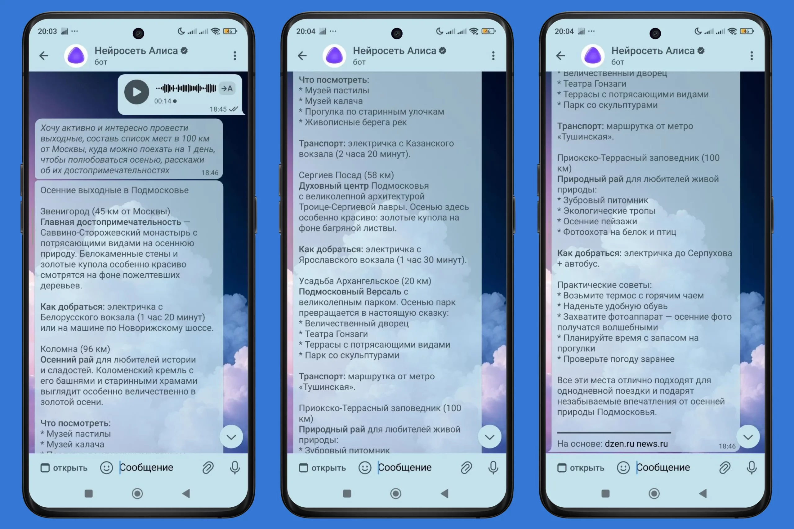Бот прислал расшифровку голосового сообщения, а в ответе предложил пять направлений, рассказал, как добраться, что посмотреть, дал практические советы: