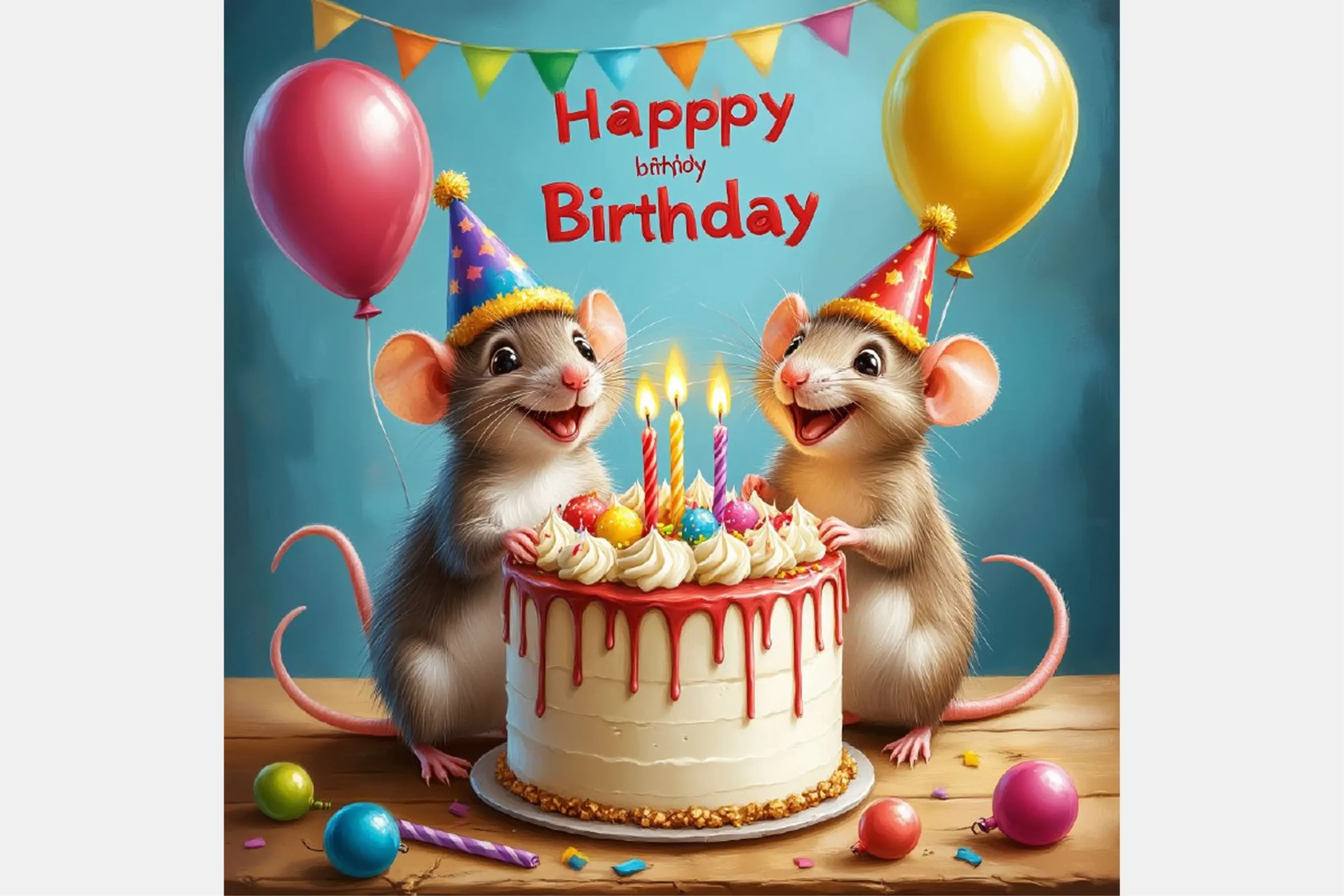 Сделай открытку на день рождения лучшей подруги в мультяшном стиле. На картинке обязательно должны быть большой торт со взбитыми сливками и свечками, две крыски в праздничных колпачках и яркие воздушные шарики. Добавь надпись: «С днем рождения, моя любимая крыска!»