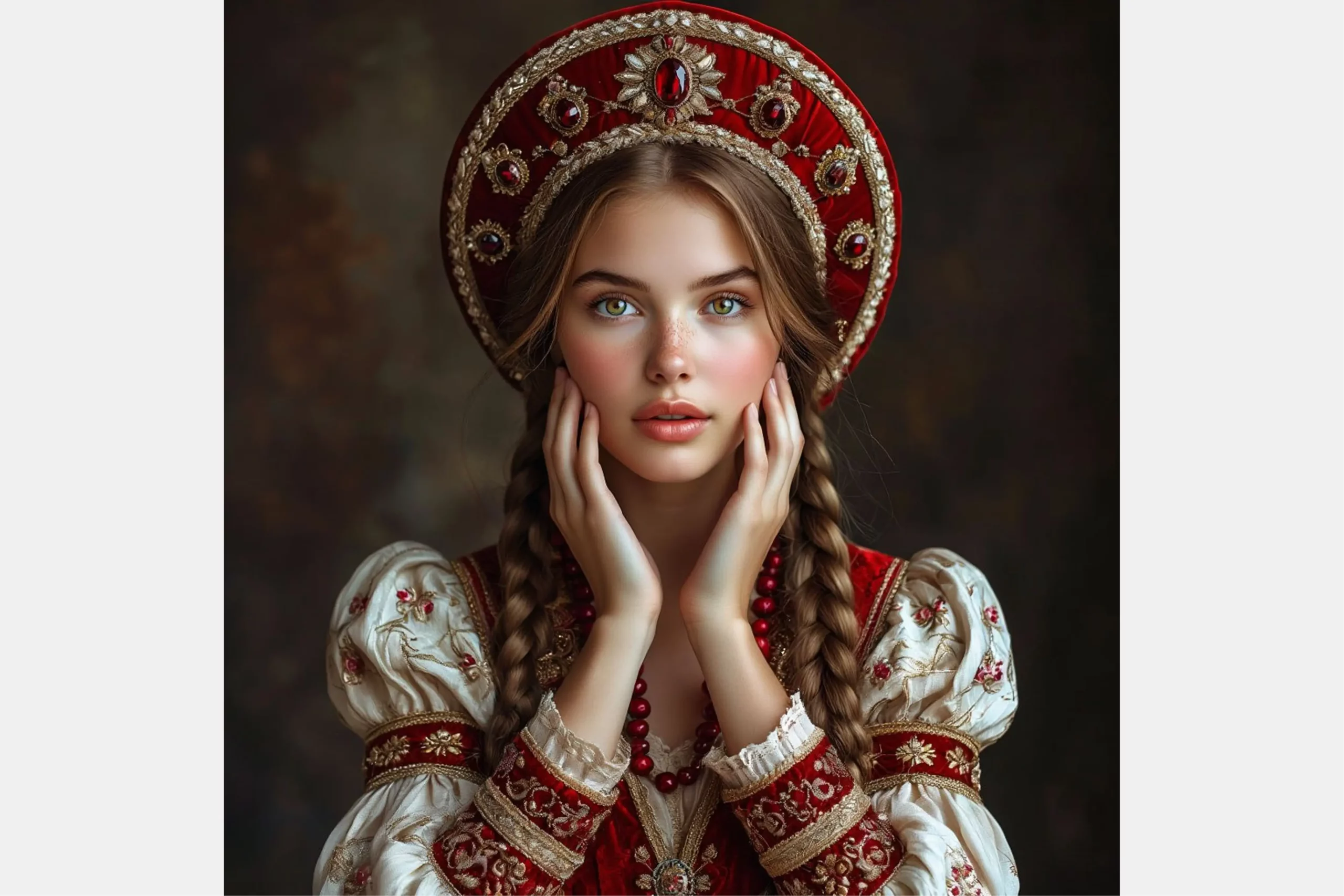 Нарисуй фотореалистичное изображение женщины 25 лет славянской внешности. Длинная коса, кокошник, яркое народное платье на современный манер, гранатовые бусы. Цветовая палитра: красный, белый, кремовый. Материалы: лен, бархат, золото. Портрет с руками возле лица.