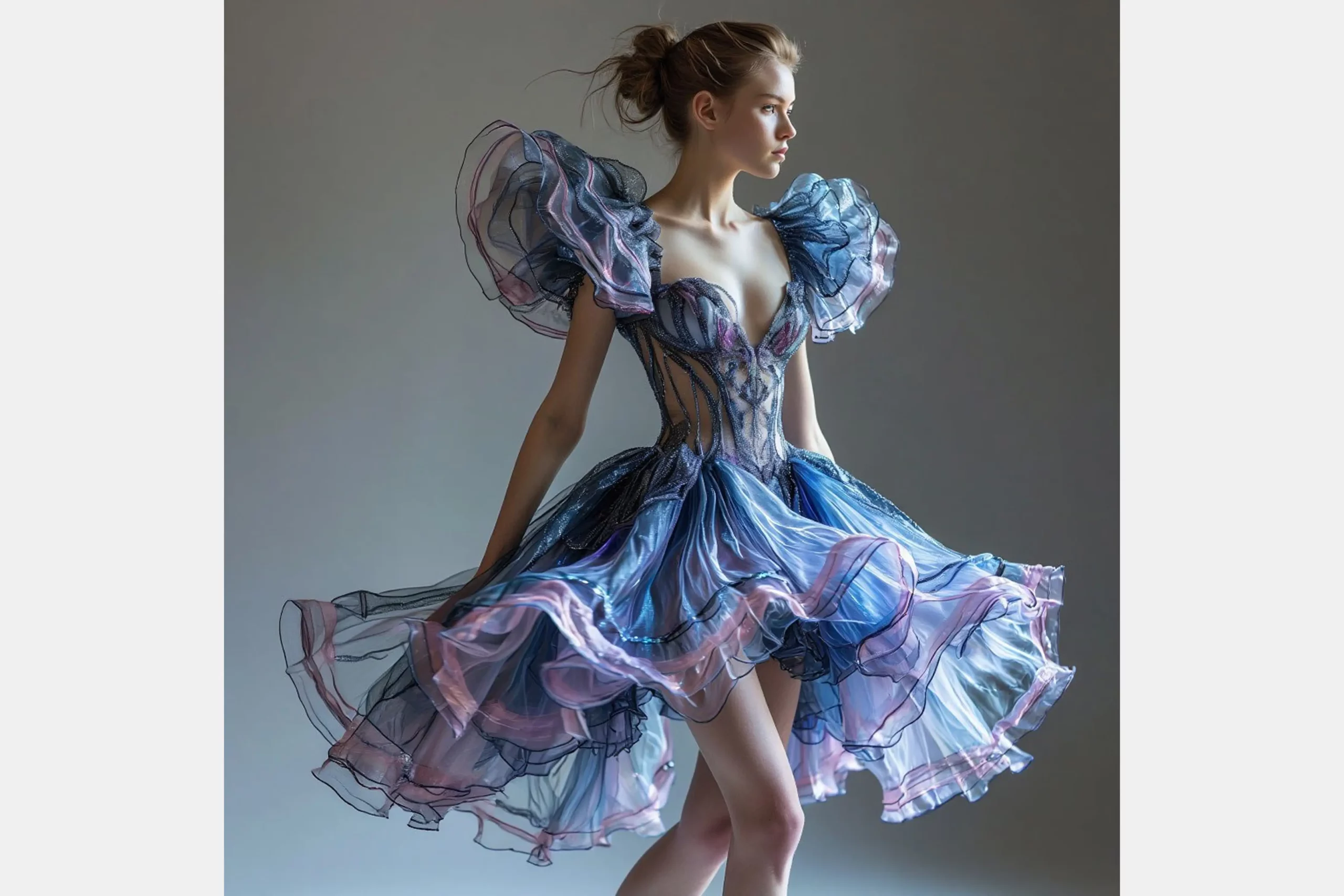Нарисуй фотореалистичное изображение женской модели из коллекции Александра Маккуина Plato’s Atlantis 2010 года. Цветовая палитра: синий, фиолетовый, черный, серебристый металлик, белый с легким розовым оттенком. Материалы: металл, органза, прозрачный шелк, сетка. Силуэт, подражающий форме медуз: широкие плечи и приталенное платье с короткой юбкой. Фотография в полный рост, в движении, сбоку.