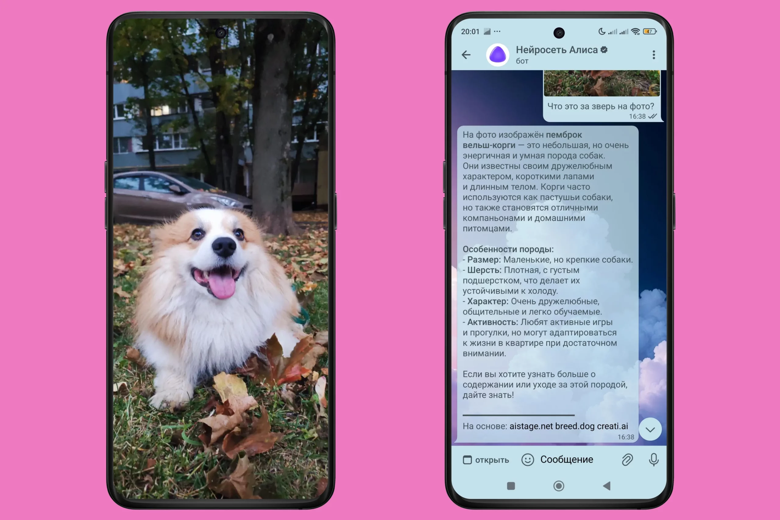 Мы показали Алисе фотографию собаки породы вельш-корги-пемброк. ИИ-бот распознал породу и рассказал о ее особенностях: