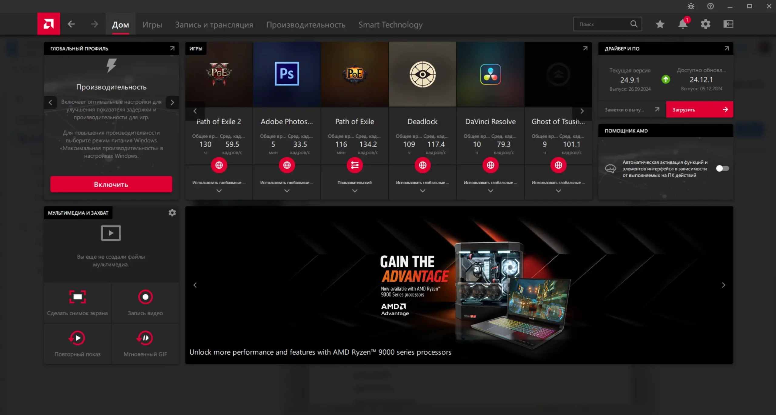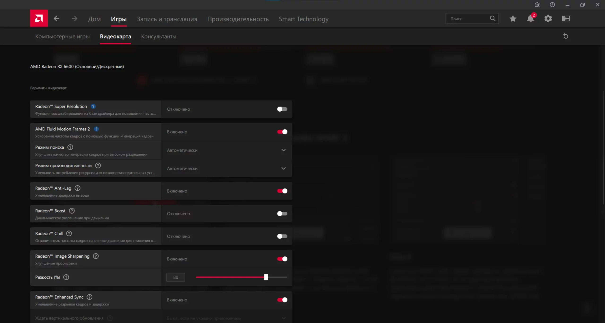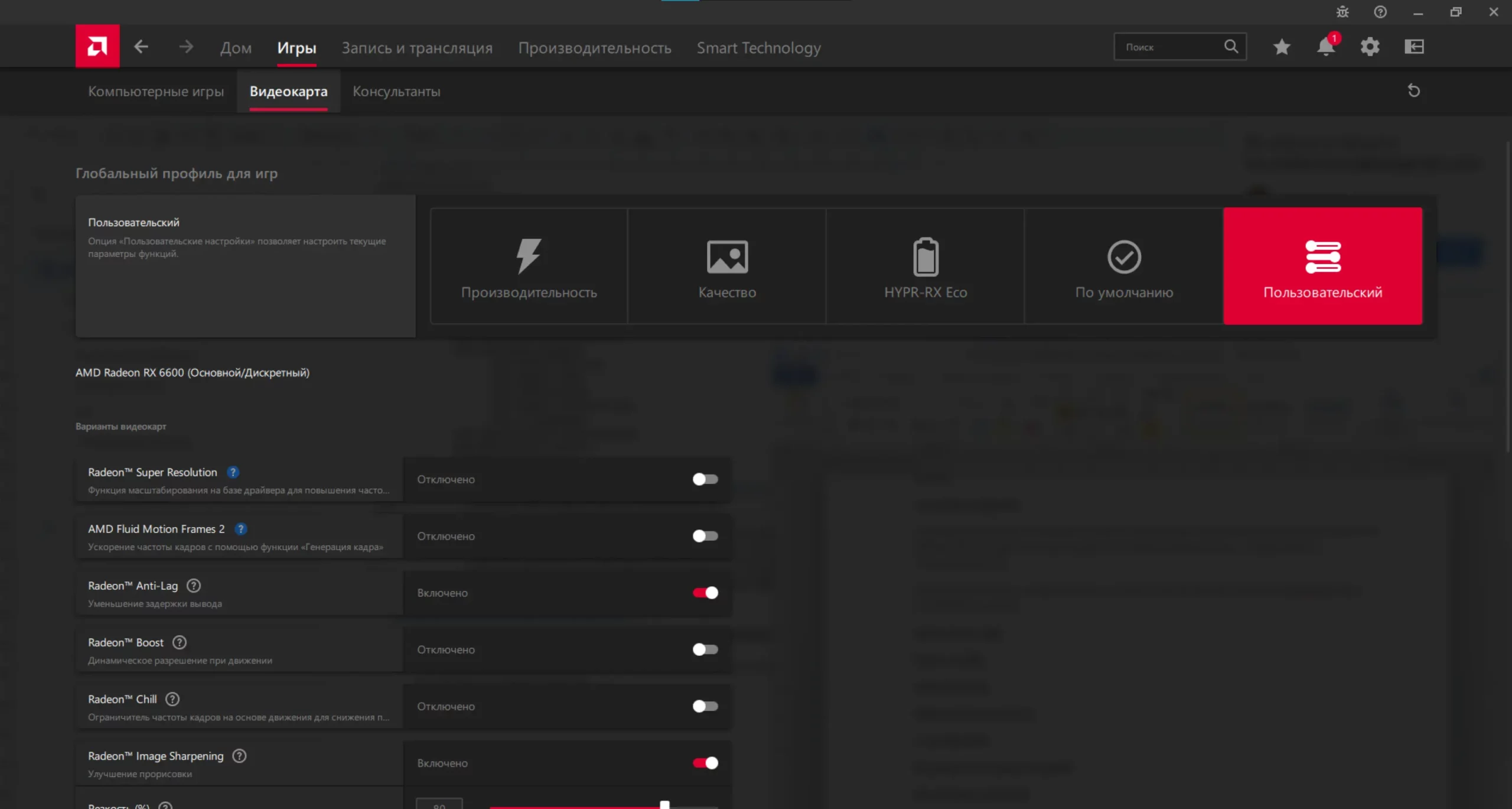 Разобравшись с основными вкладками, рассмотрим подробнее некоторые ключевые функции настроек AMD Adrenalin для игр.