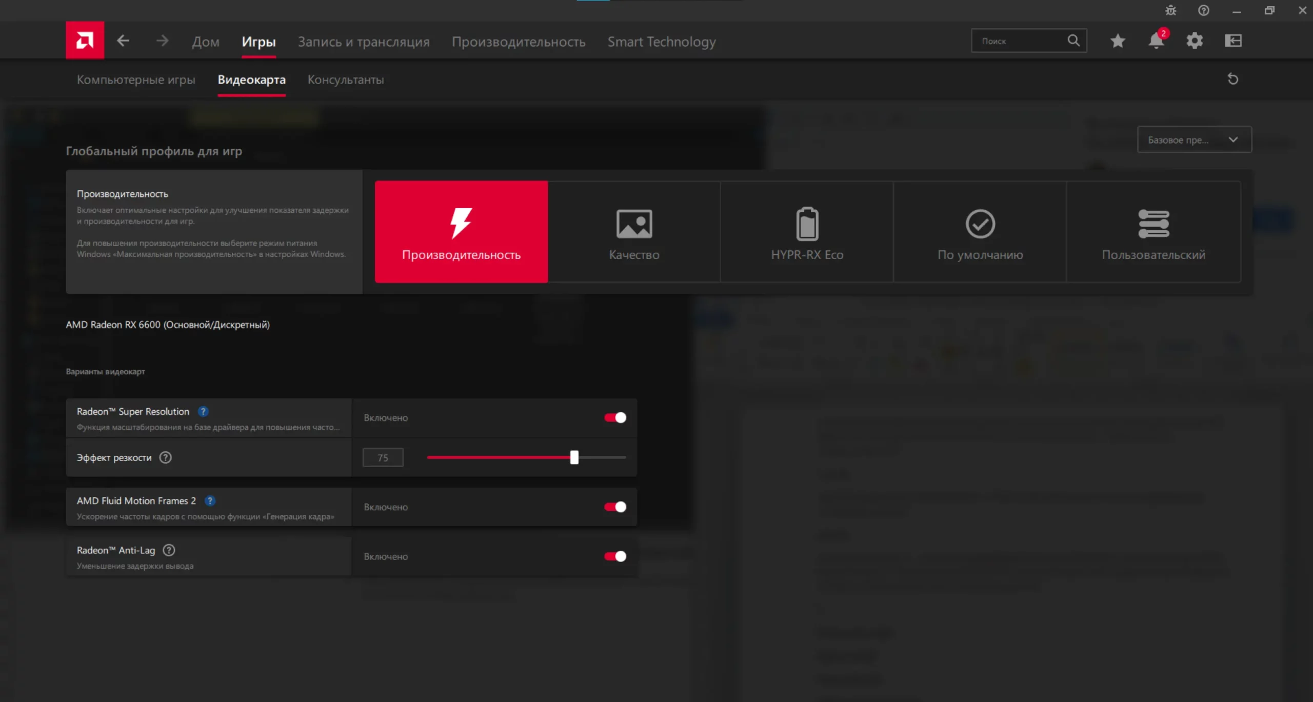 Производительность. Эта настройка активирует апскейлер Radeon Super Resolution и генератор кадров Fluid Motion Frames 2, повышая резкость до 75%. А также включает Radeon Anti-Lag для снижения задержки вывода, которая появляется из-за генератора fps. Режим подойдет для случаев, когда нужно получить максимум кадров в секунду.