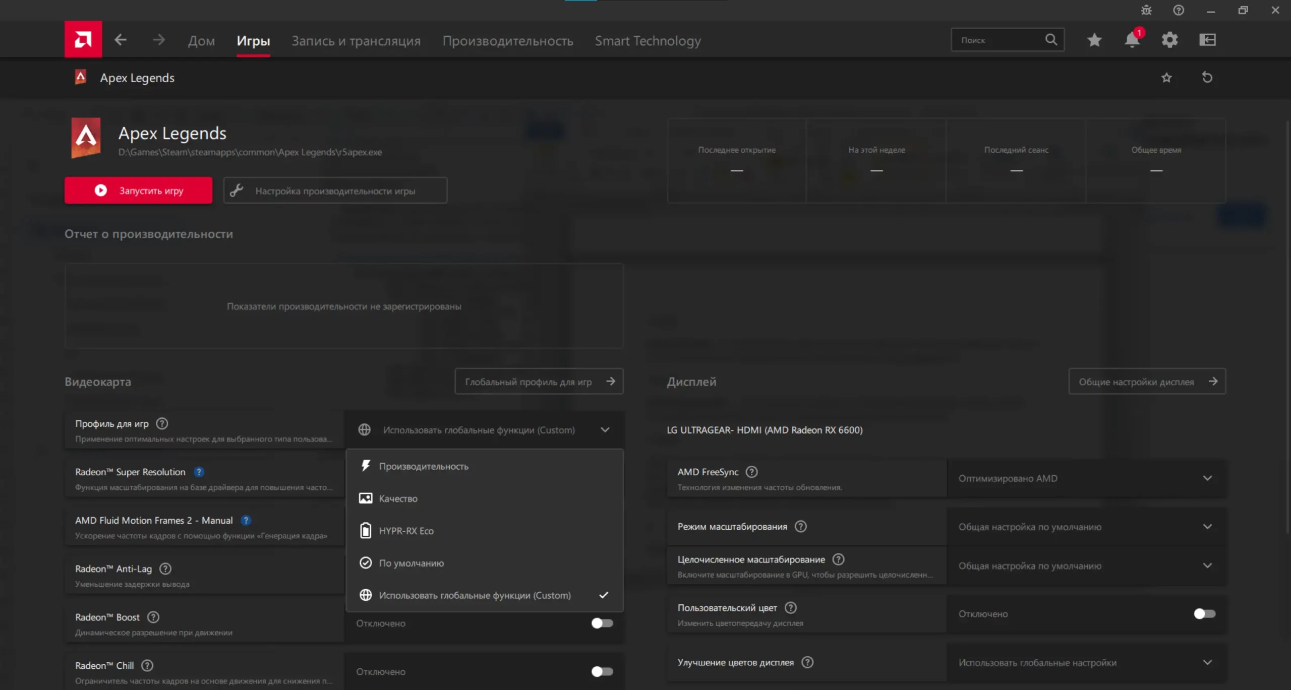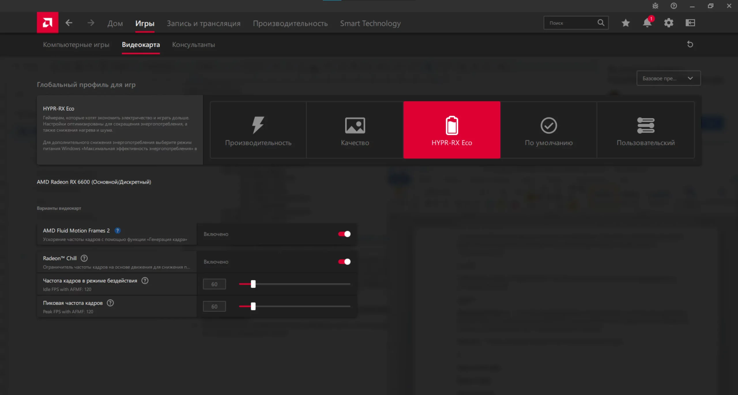 HYPR-RX Eco. Шаблон включает генератор кадров Fluid Motion Frames 2 и Radeon Chill для ограничения fps до 60 кадров в секунду. Он подойдет для маломощных систем и ноутбуков с интегрированной графикой AMD, например HONOR MagicBook X16 Plus.