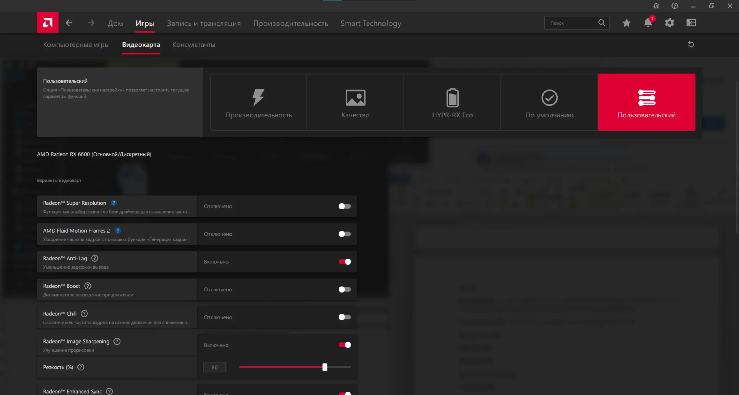 Качество. Пресет повышает резкость до 80% и включает Radeon Anti-Lag. Рекомендуется, когда нет проблем с производительностью.