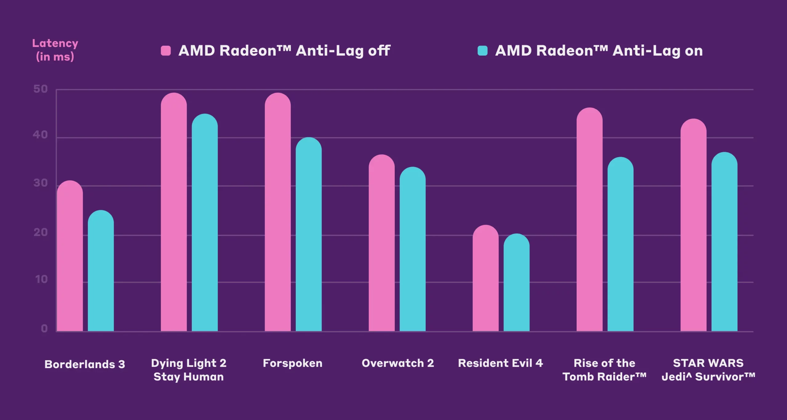 Программная фишка для уменьшения задержки между действием пользователя и визуальным откликом. Например, Anti-Lag сокращает время между тем, как вы нажали ЛКМ для выстрела в игре, и визуальным отображением выстрела на экране. Задержка системы редко превышает 50 мс, а Anti-Lag дополнительно уменьшает ее на несколько десятков процентов.