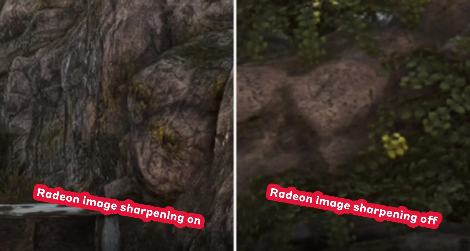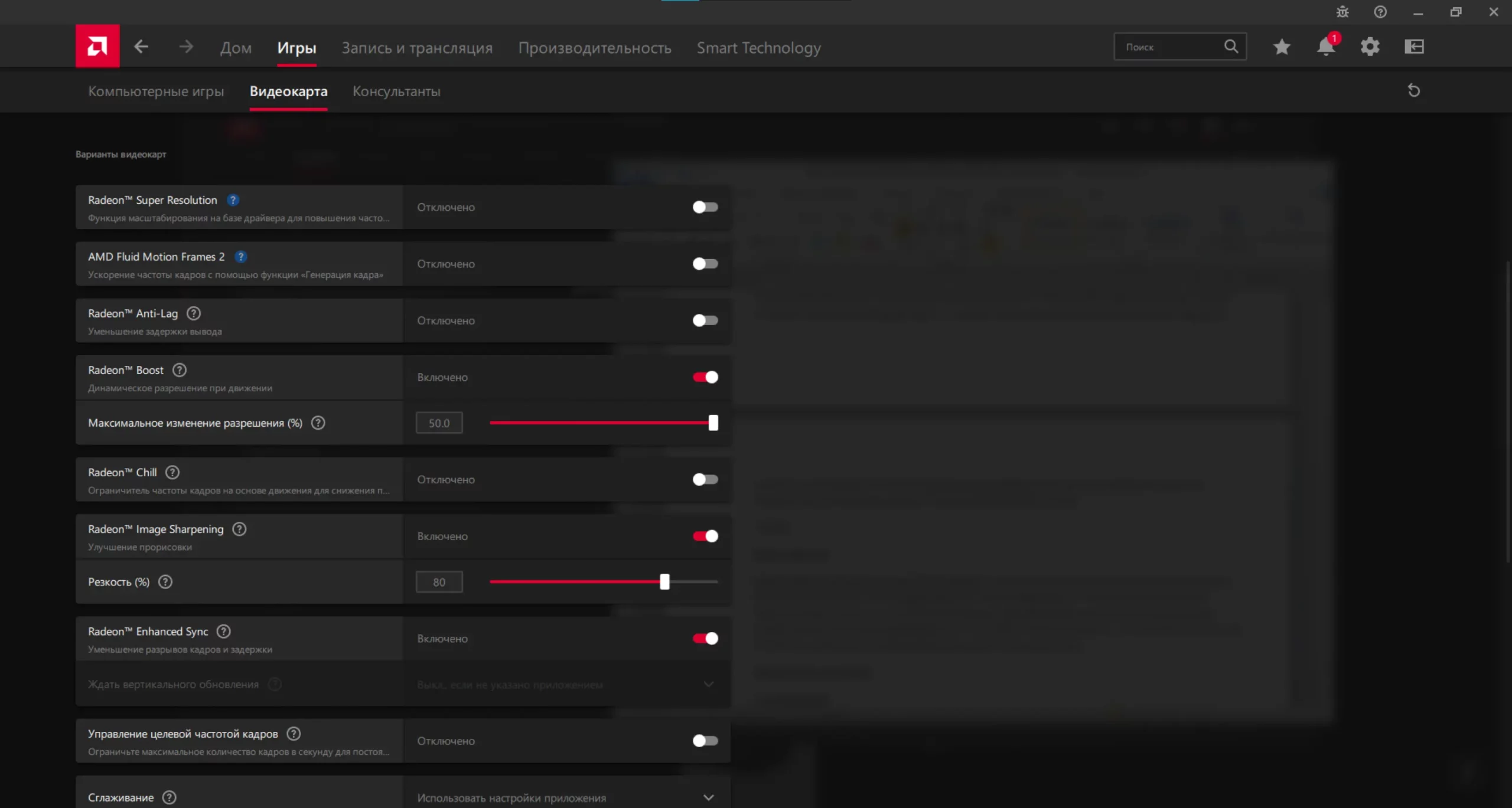 Еще одна очень крутая фишка — Image Sharpening. Технология повышает резкость изображения на величину от 10 до 100%. Обязательна к включению при использовании апскейлеров FSR или Radeon Super Resolution.
