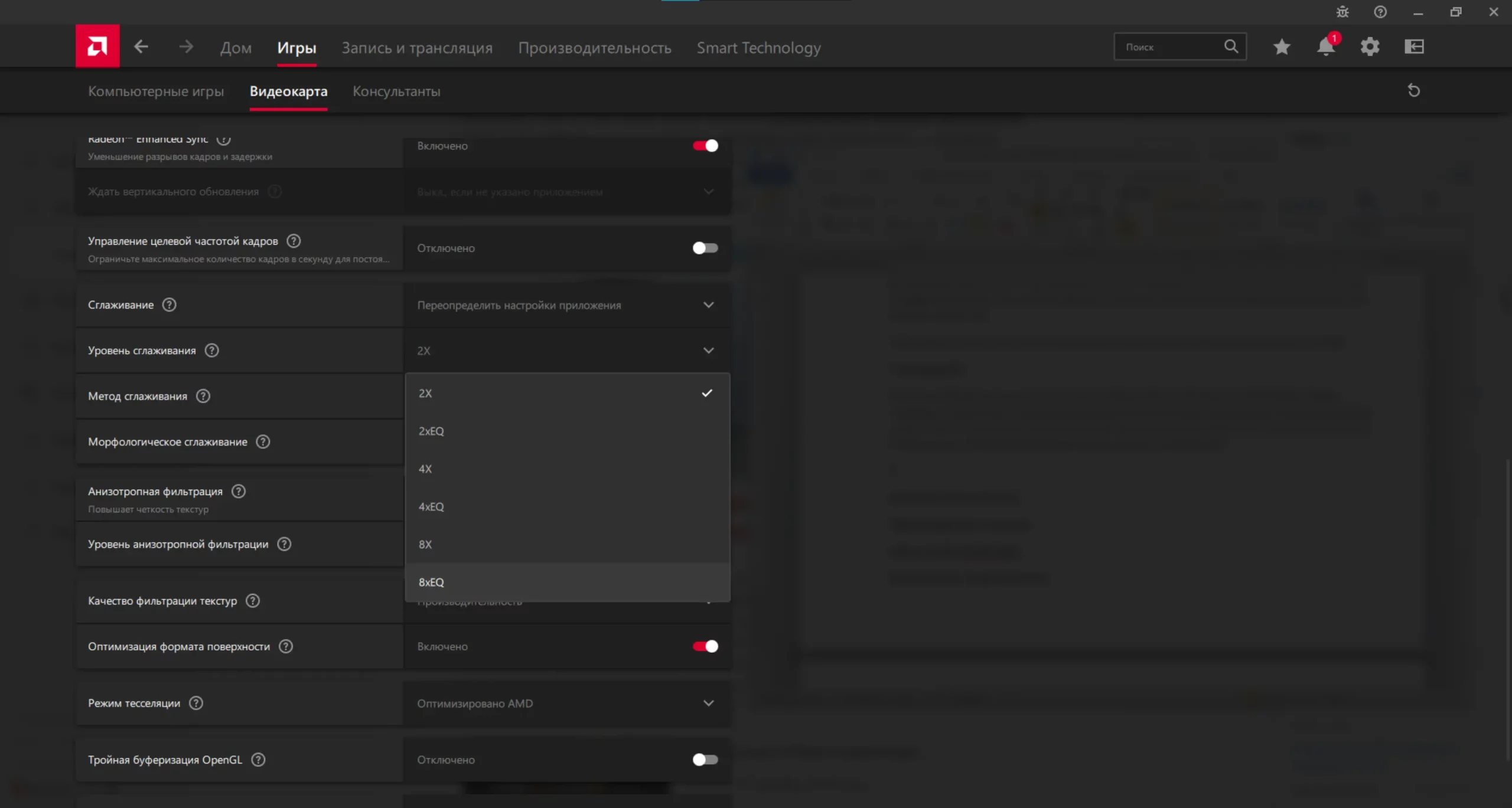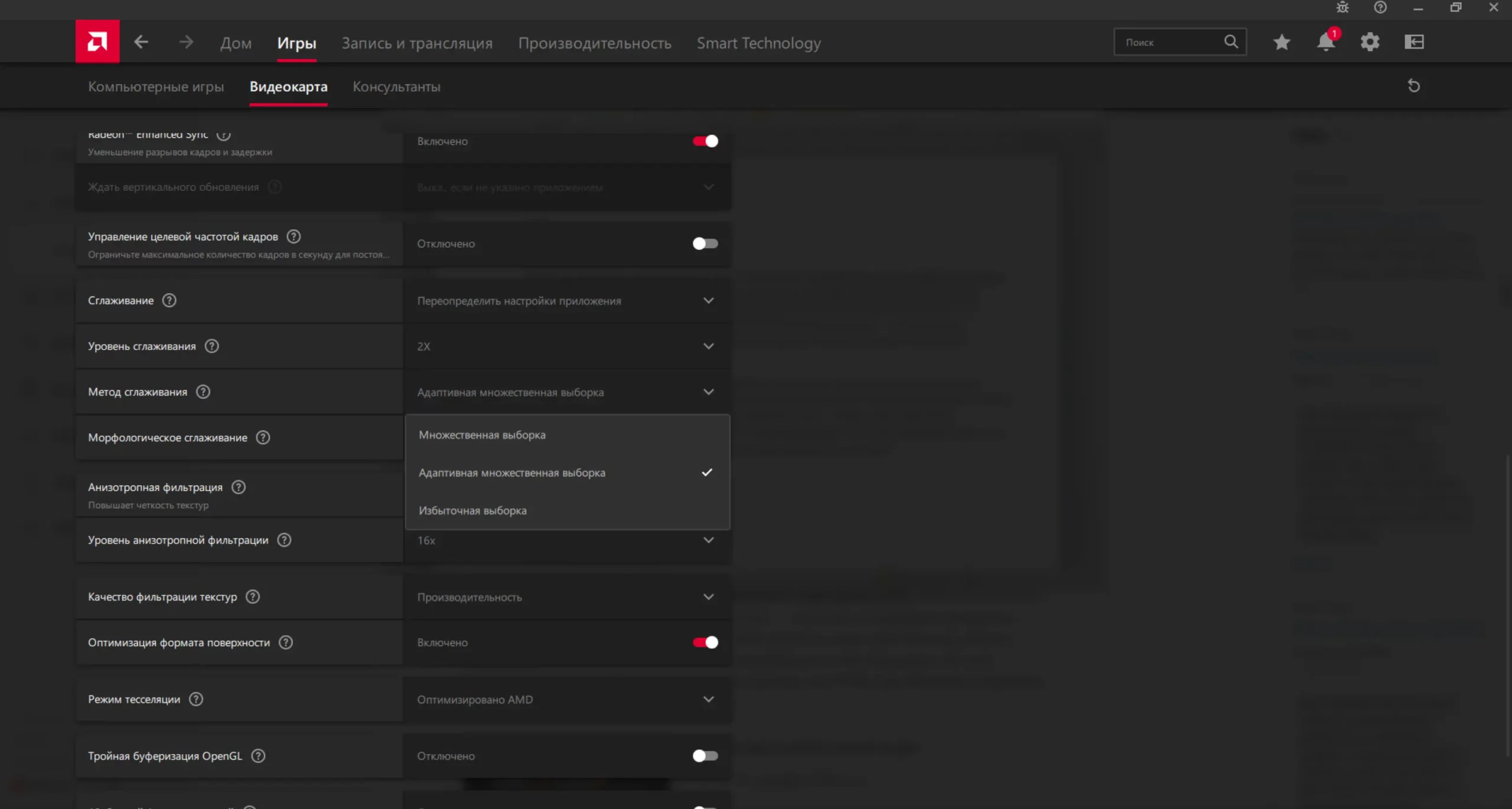 Многим геймерам знакома технология сглаживания (Anti-Aliasing), которая убирает эффект «лесенки» на текстурах. По умолчанию игровые параметры переопределяют настройки AMD Adrenalin. Однако можно сделать и обратное: переопределить настройки сглаживания в Radeon Software. Выбрать можно из шести параметров: