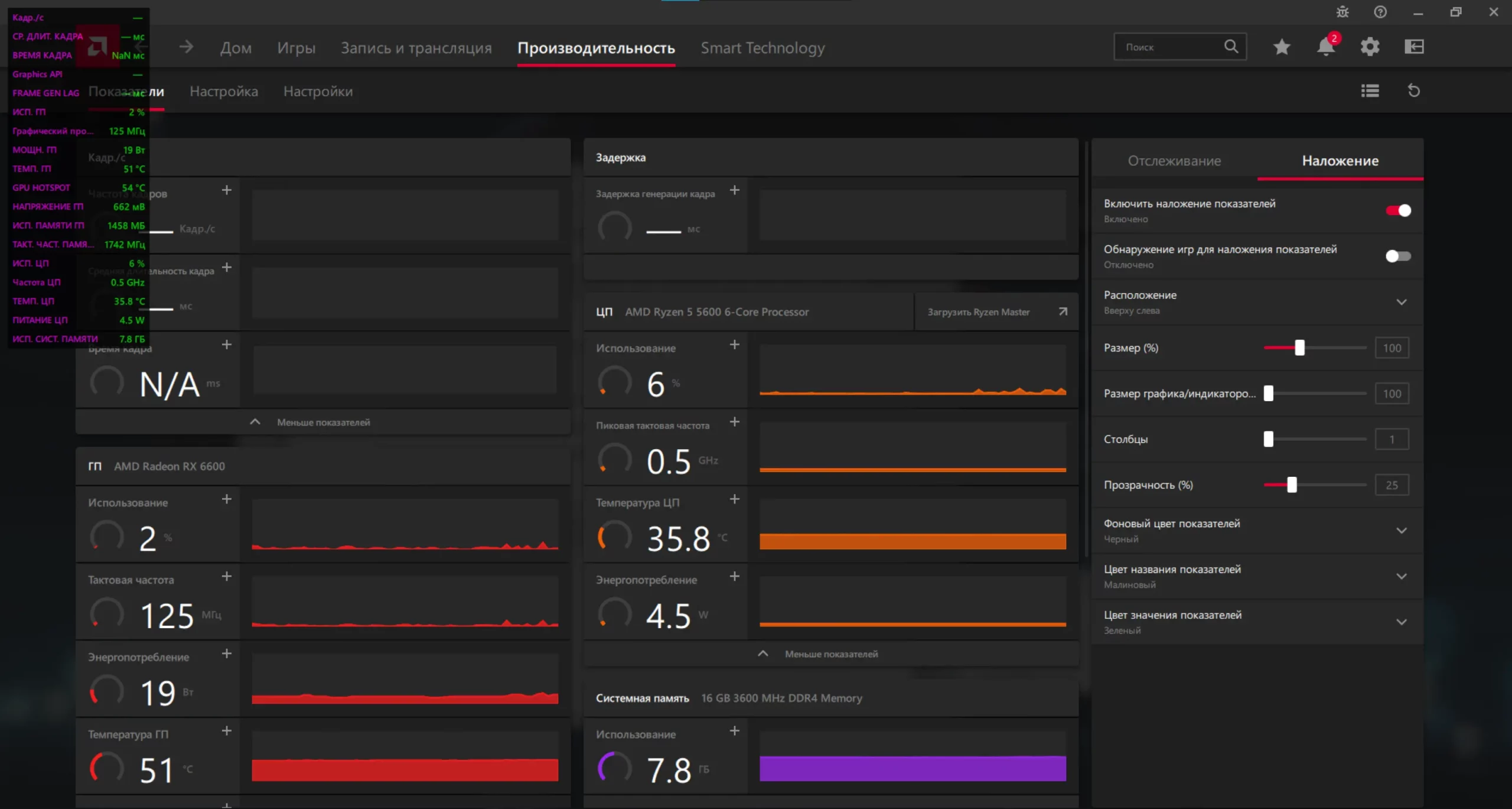 В Radeon Software есть удобный встроенный оверлей для мониторинга производительности железа. По умолчанию он открывается нажатием сочетания клавиш Ctrl + Shift + O. Если этого не происходит, проверьте, что функция включена в настройках: