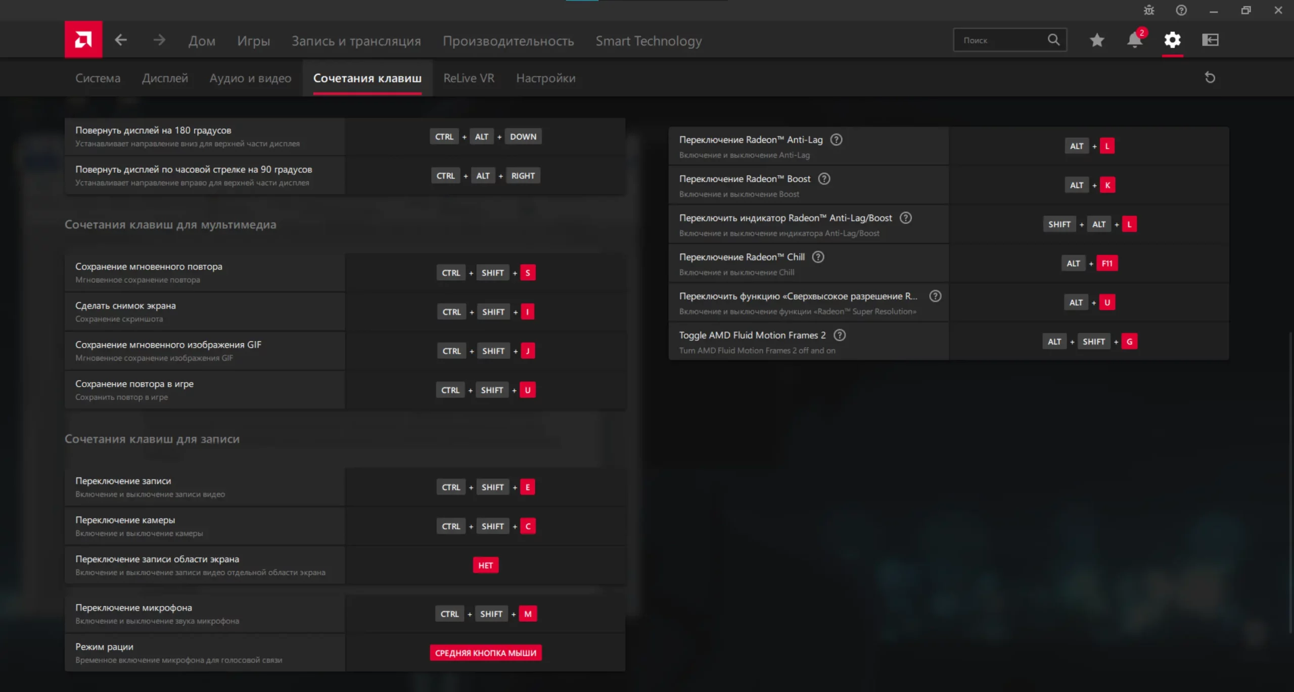 Активировать запись можно сочетанием клавиш. Их значение меняется в соответствующей вкладке Radeon Software.