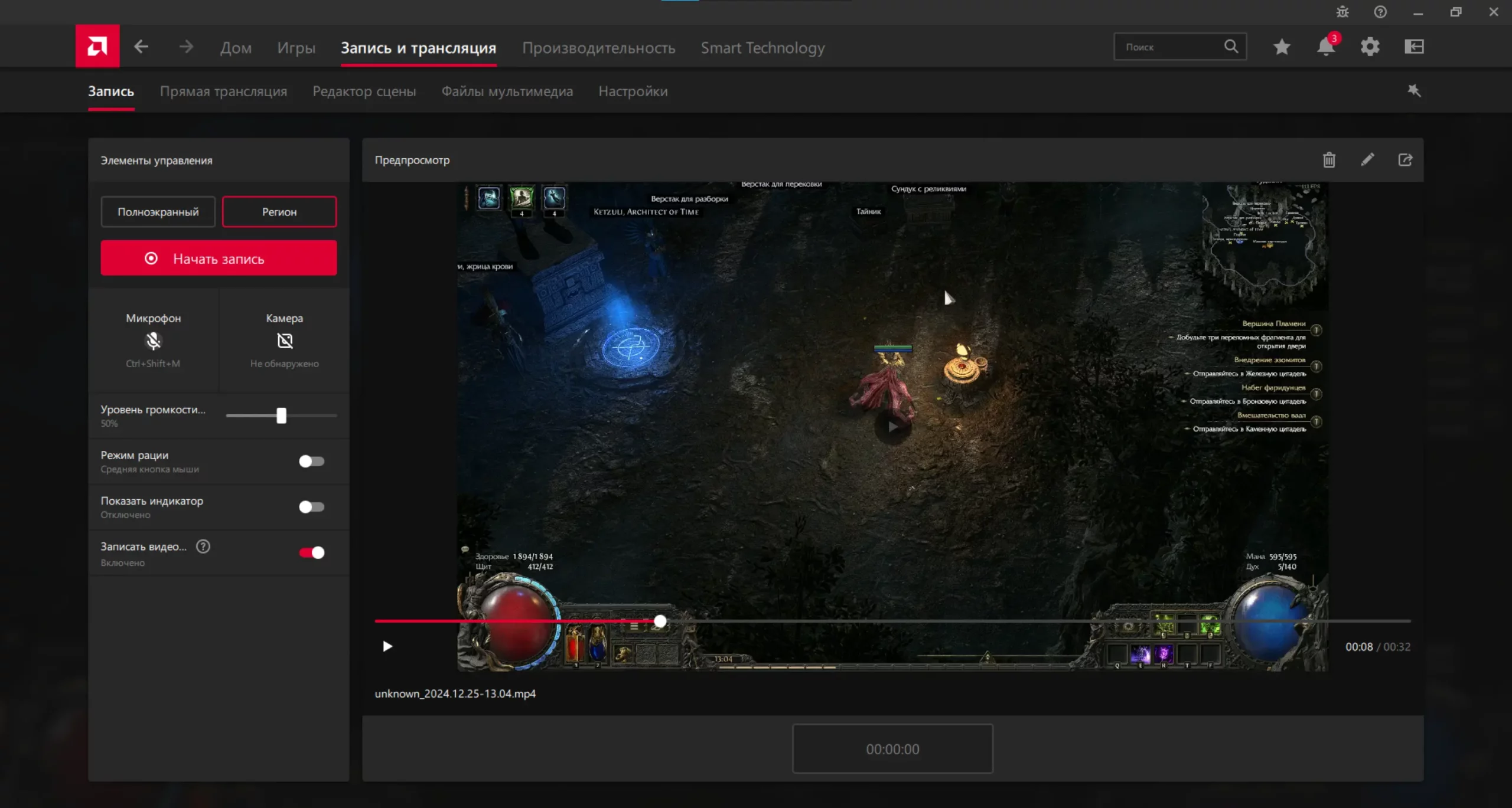 После основных настроек можно переходить к настройкам сцен. Для записи видео во вкладке «Запись» можно включить захват полного экрана или региона (отдельного окна). При этом, если вы хотите захватить отдельное окно, лучше всего включать запись сочетанием клавиш уже из запущенного приложения, а не из Radeon Software. Так как в последнем случае автоматом включается запись видео с рабочего стола. То есть источником выступает весь экран.