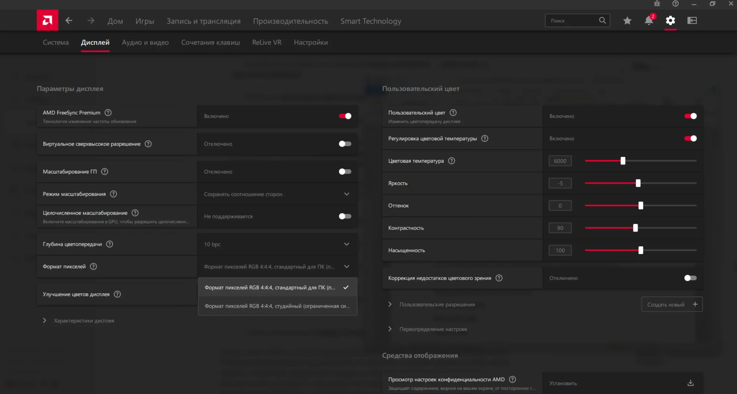 Формат пикселей. Стоит оставить по умолчанию стандартный для ПК полный охват RGB 4:4:4. Студийный вариант ограничивает спектр, из-за чего цвета тускнеют, что будет особенно заметно в играх.