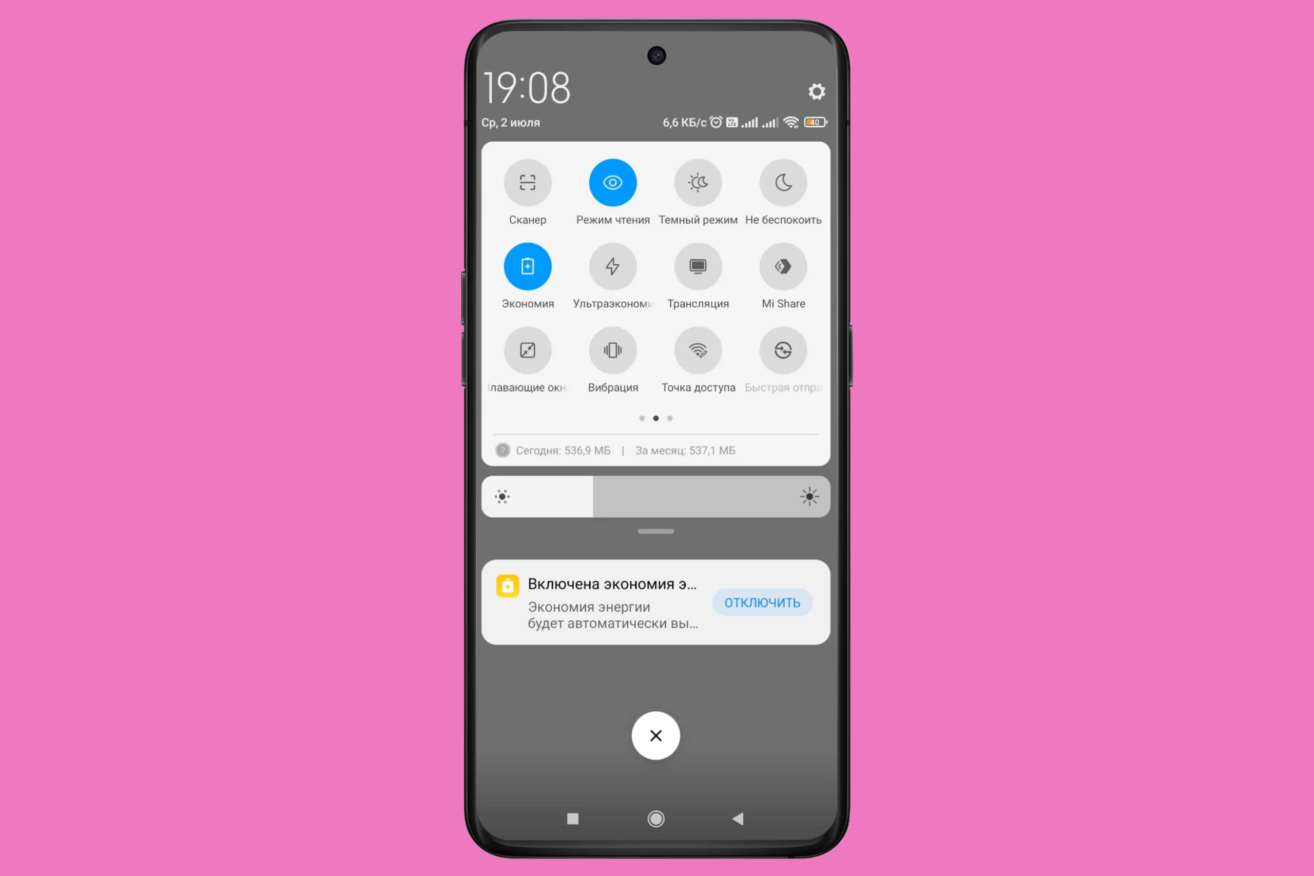 Также стоит проверить, не активирован ли режим энергосбережения, который может ограничить зарядку. Его можно отключить двумя способами. Либо потяните верхнюю «шторку» экрана, нажмите на «Режим экономии энергии» (его иконка обычно выглядит как батарейка), если он активен — иконка подсвечена цветом.