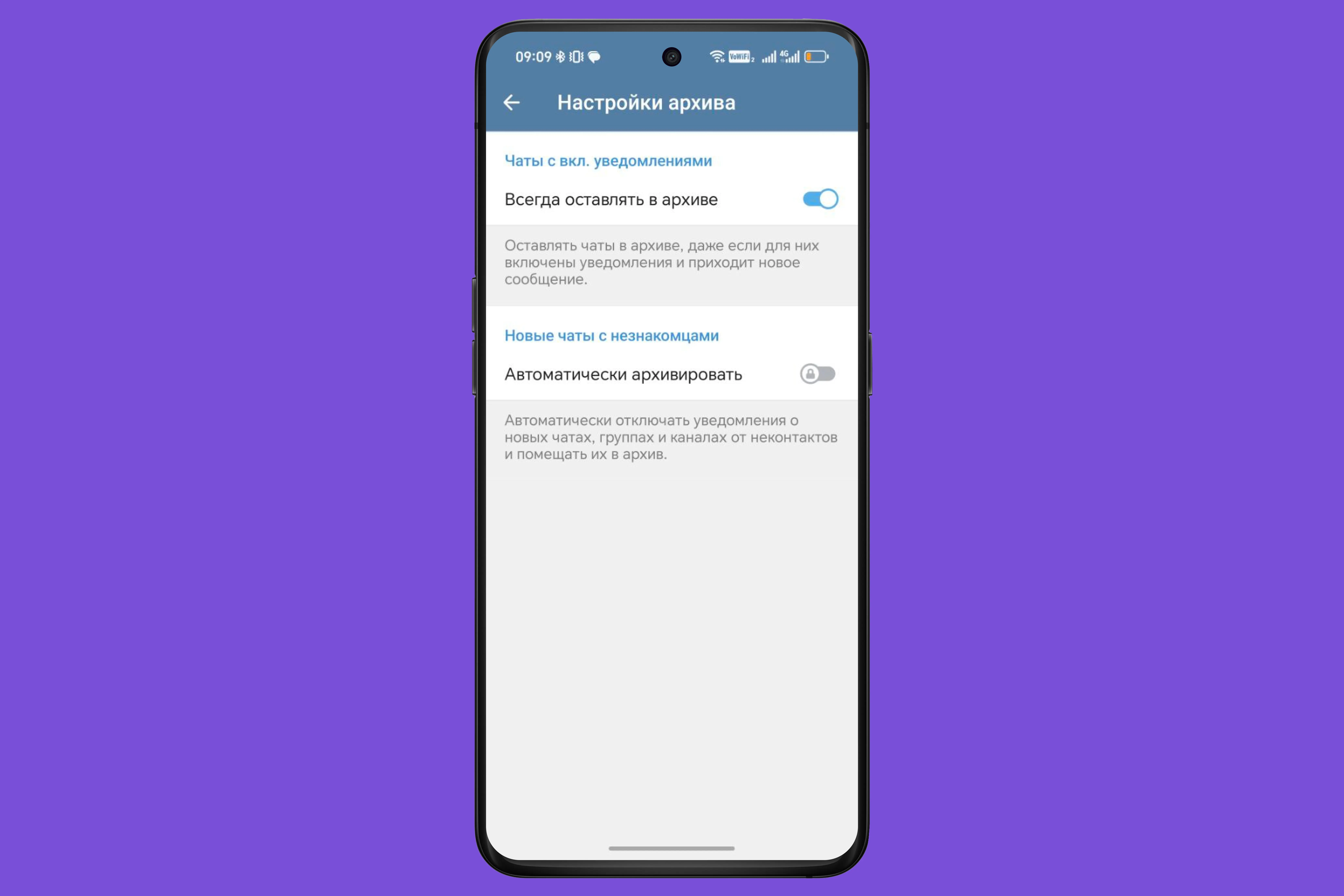 - Всегда оставлять в архиве — включите эту функцию, чтобы чаты с включенными уведомлениями не выпрыгивали в общую ленту при новом сообщении.