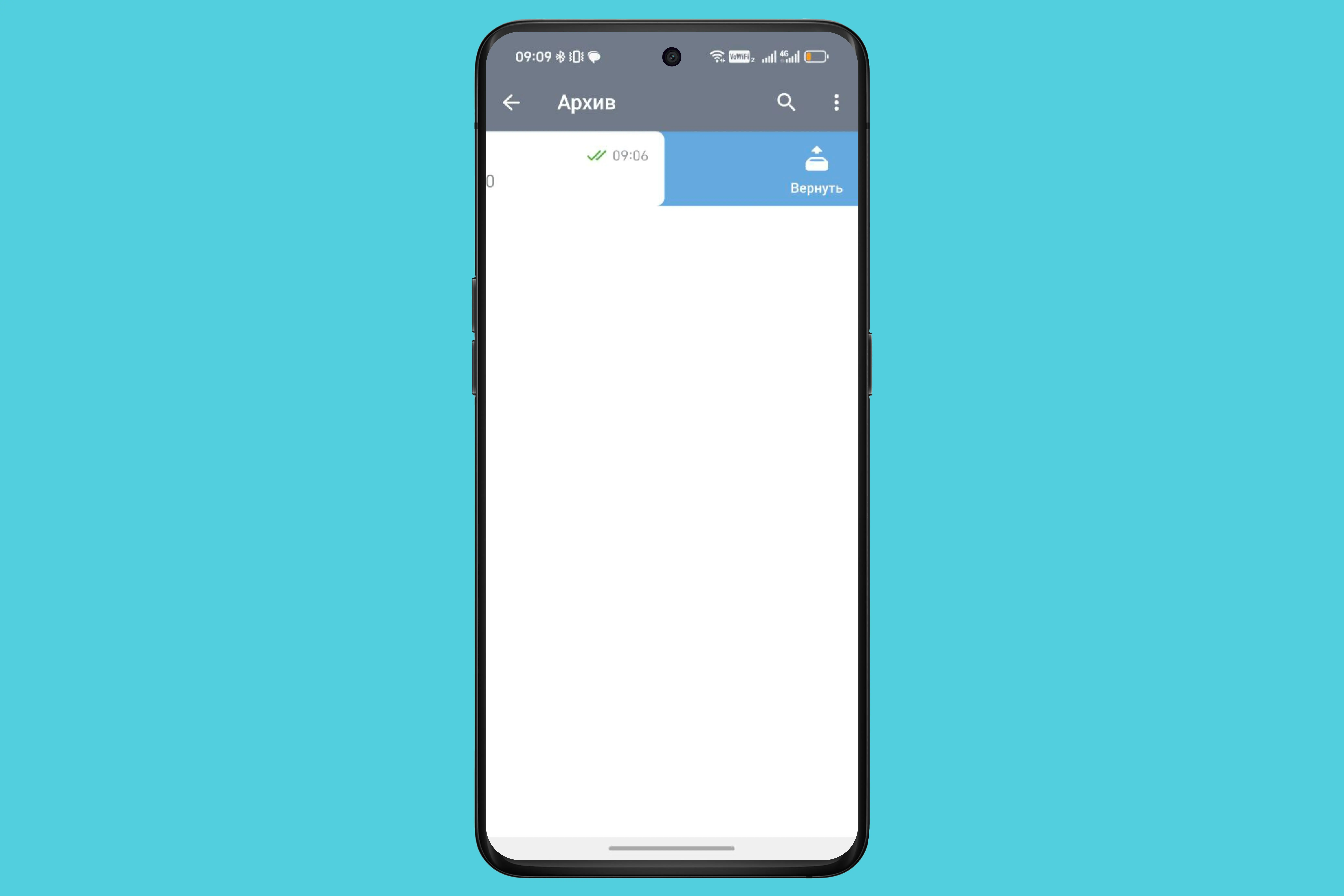 - Свайп влево — и «Вернуть» (или иконку со стрелкой вверх). Либо удерживайте палец на чате, нажмите три точки и выберите «Вернуть».