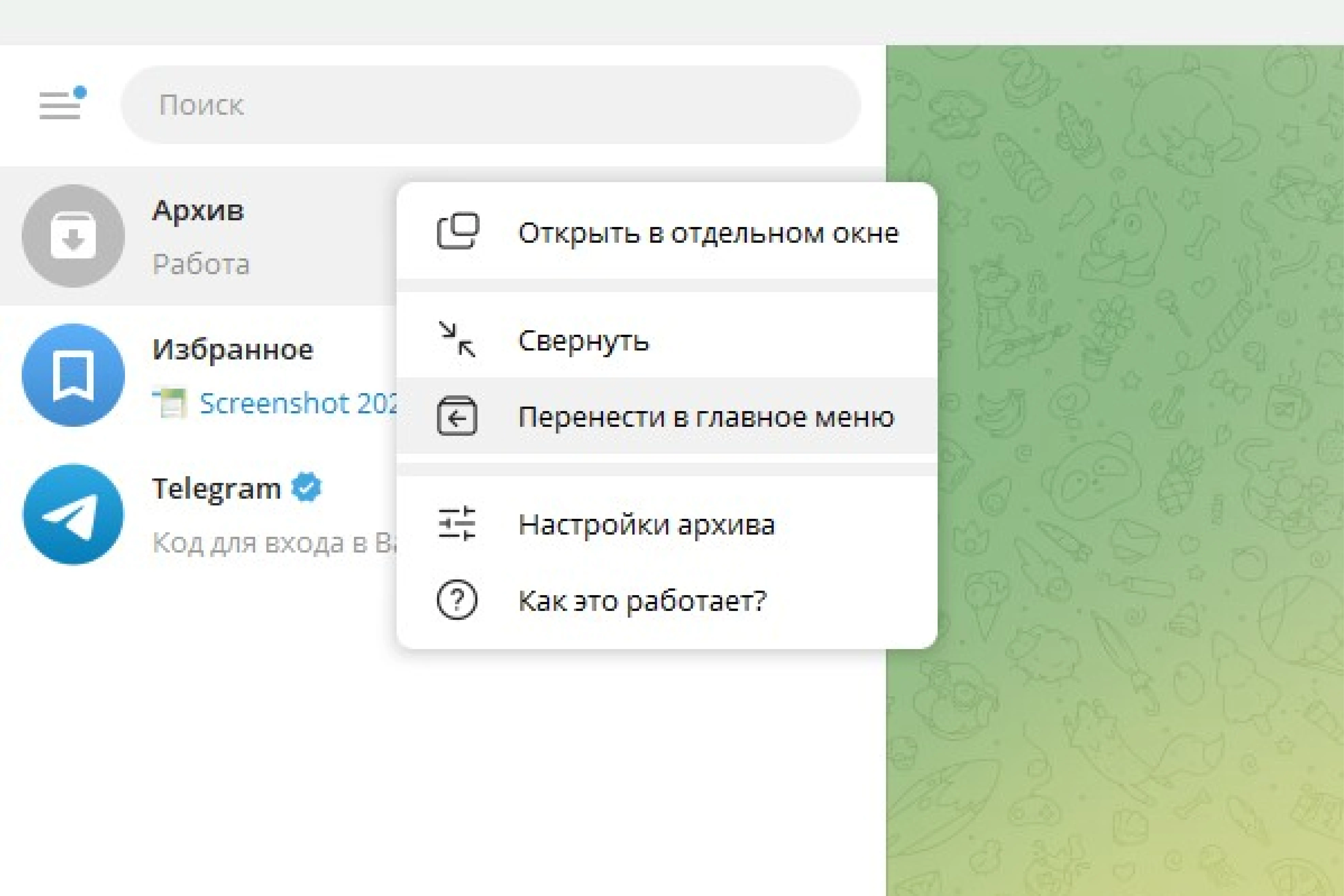 Бывает, что архив мешает вам в списке чатов слева.
