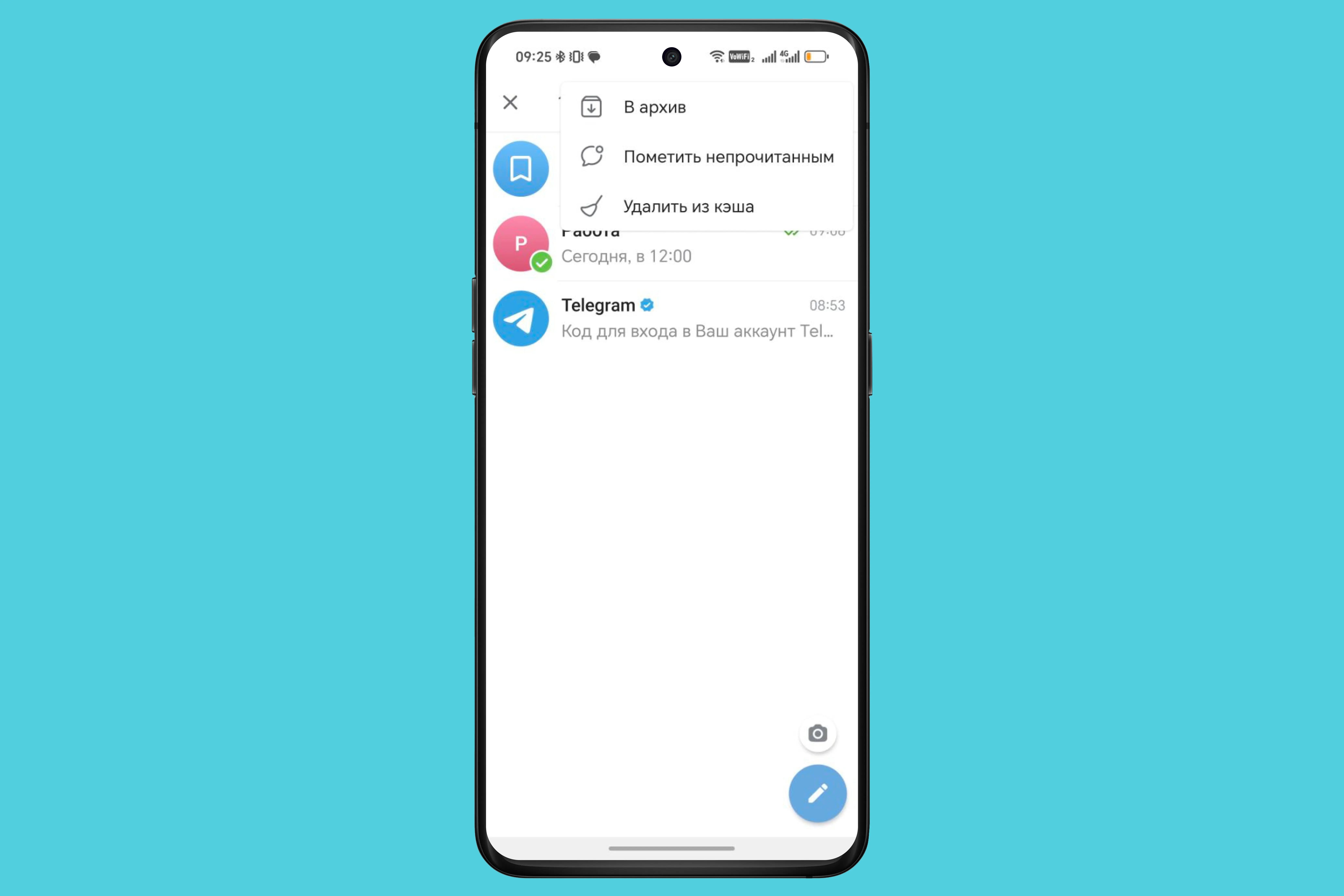 - Длинный тап. Найдите чат, нажмите на него и удерживайте. Сверху появится меню. Нажмите на иконку коробки со стрелкой (это и есть «В архив»).