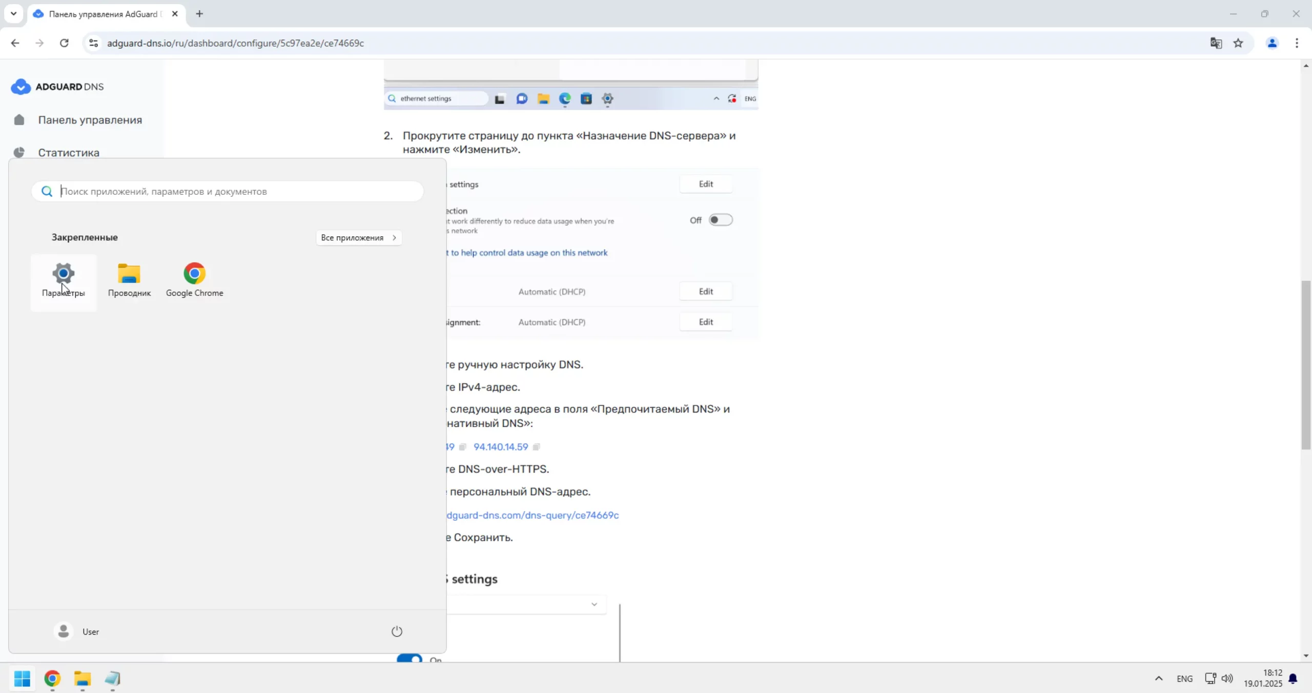 4. Скопируйте HTTPS-адрес DNS, который даст вам AdGuard. Затем нажмите кнопку «Пуск», чтобы открыть одноименное меню (подключение частного DNS вручную).