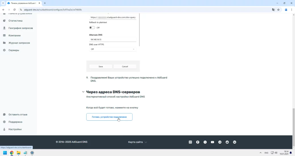 10. Сохраните изменения. Закройте «Параметры». Нажмите в личном кабинете AdGuard DNS «Готово, устройство подключено».