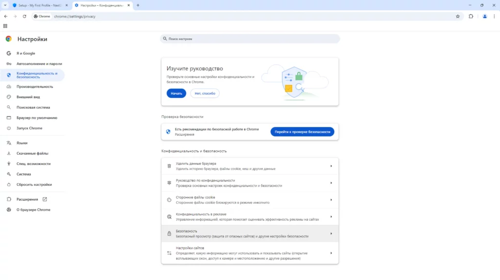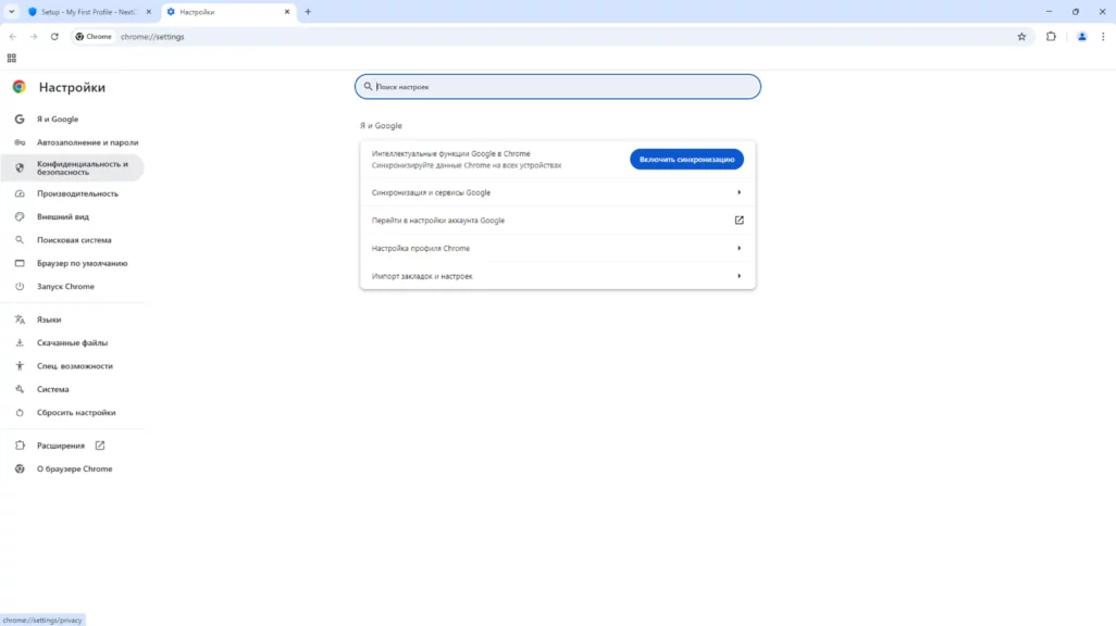 - Выберите раздел «Конфиденциальность и безопасность» в списке слева.