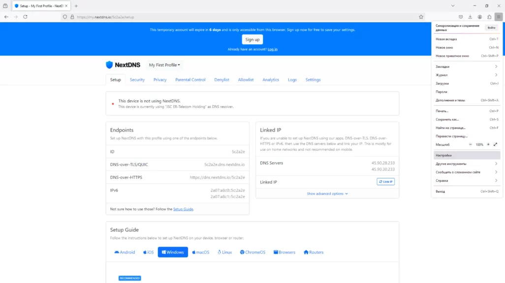 - Скопируйте адрес DNS из личного кабинета NextDNS. Нажмите на три горизонтальные линии справа вверху. В контекстном меню выберите «Настройки».
