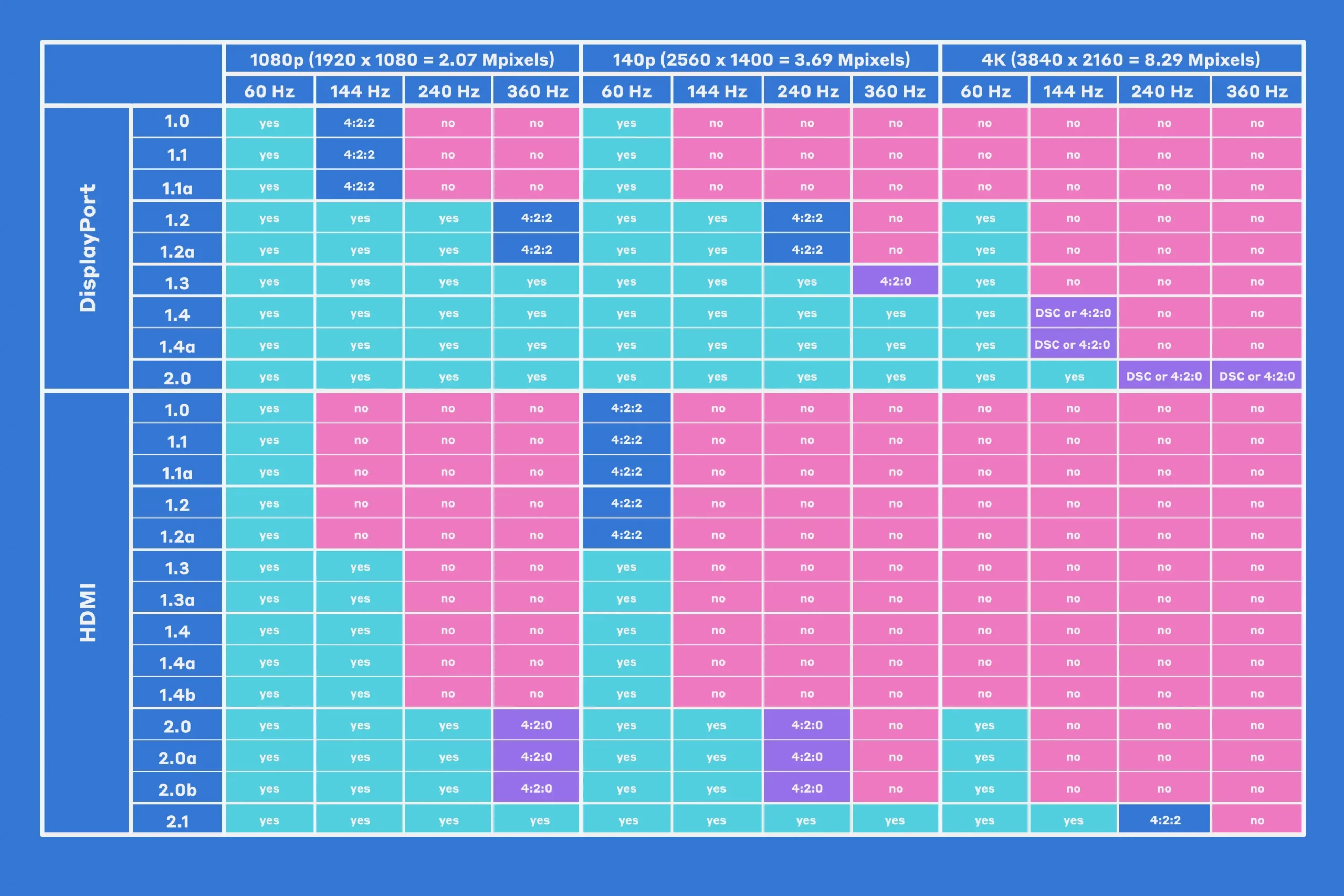 Интерфейс HDMI сам по себе менее производительный. Только HDMI 2.1 даст насладиться 4K/144 Гц. А тот же HDMI 2.0 будет ограничен 2K/240 Гц или 4K/60 Гц. Соответствие разрешений и частоты обновления версиям DisplayPort и HDMI наглядно продемонстрировано в таблице ниже.