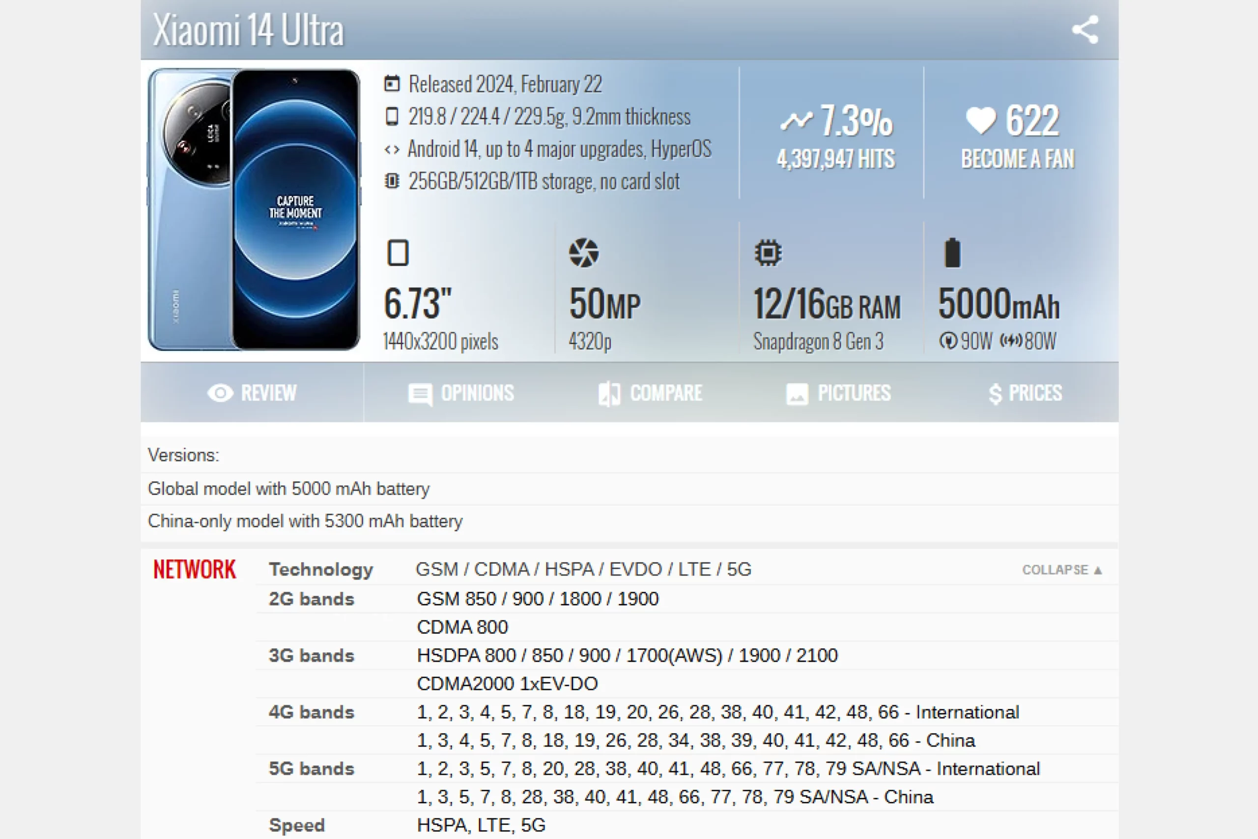 В спецификациях видно, что международная модель 14 Ultra получила 20-й бенд, а «китайская» — нет