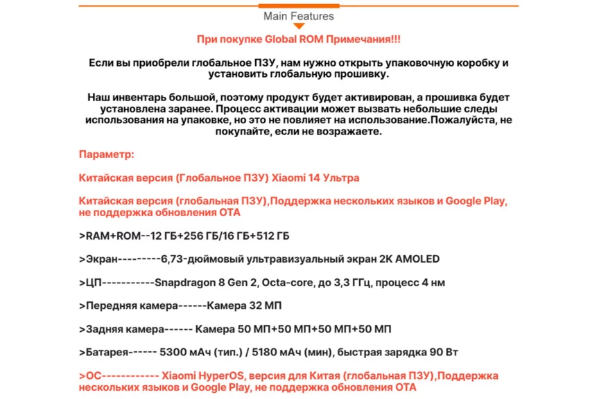 Обычно продавцы не стараются выдать «китайскую» версию за «глобальную», но запутать могут. Например, если поискать Xiaomi 14 Ultra на популярном зарубежном маркетплейсе, можно найти предложения такого плана: в заголовке написано global, global version или что это worldwide-модель Xiaomi, но на самом деле это не так.