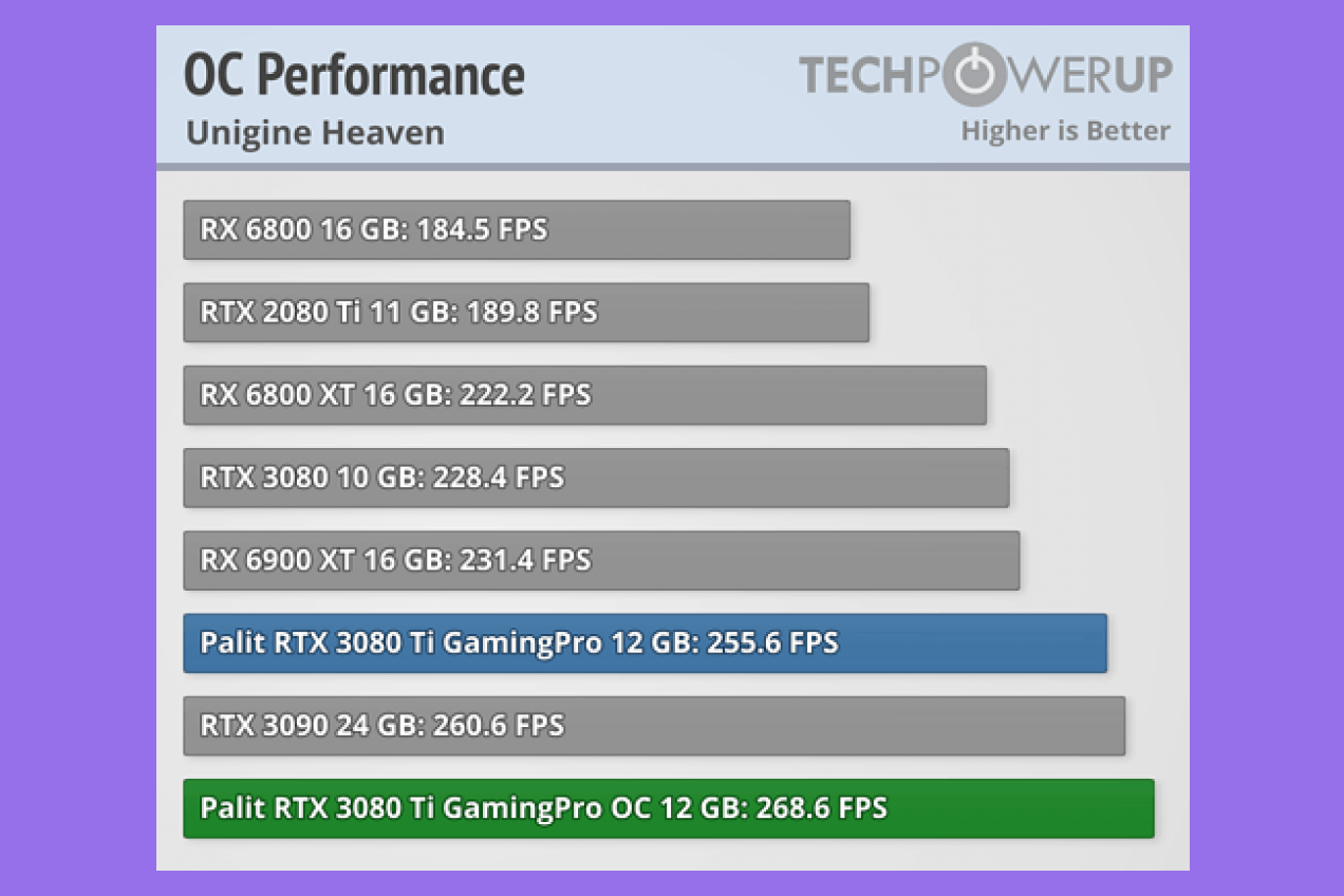 Давайте посмотрим на примере видеокарты Palit GeForce RTX 3080 Ti GamingPro 12G. Согласно опыту одного из пользователей, разогнанная видеокарта показала прирост в производительности в 5,1% и обогнала по рейтингу более современную модель RTX 3090 24 GB, которая стоит на несколько десятков тысяч рублей дороже.