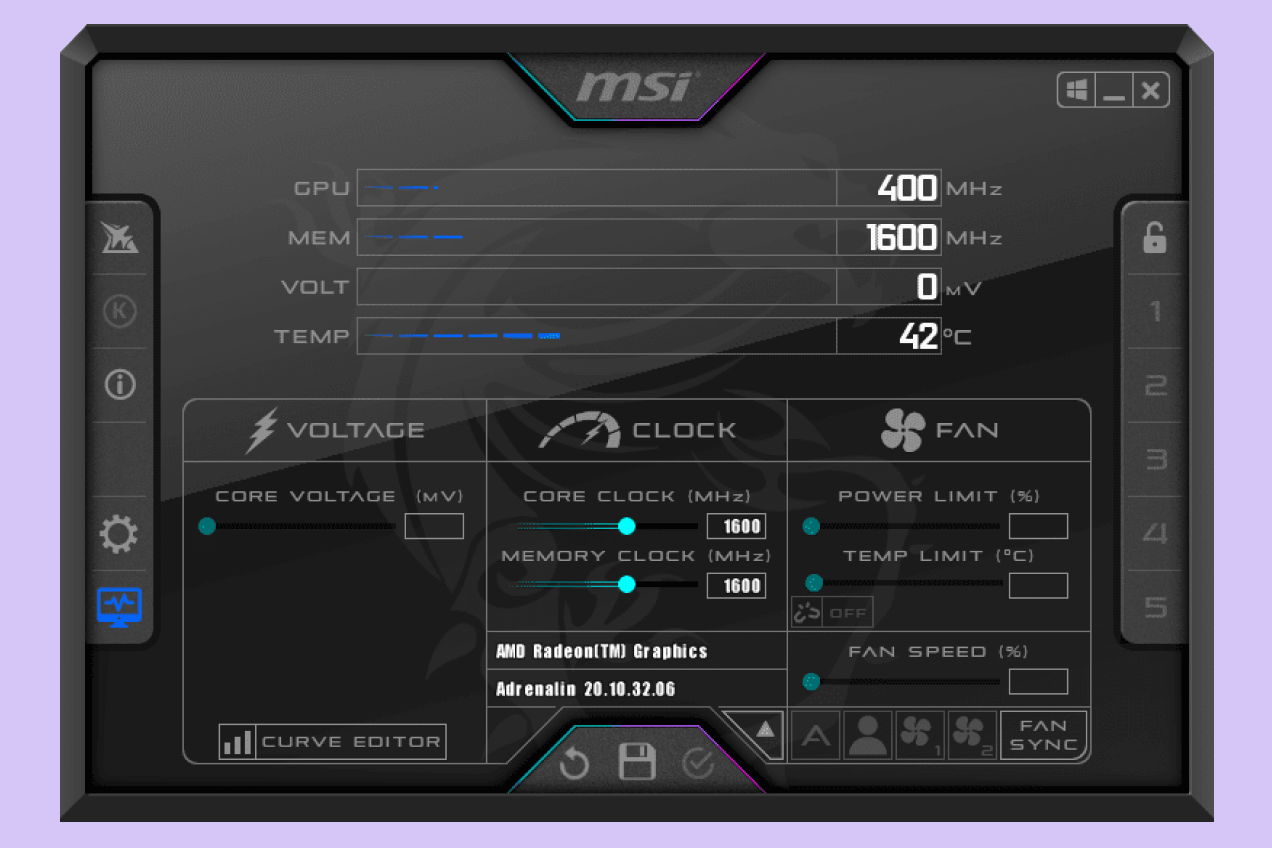 Afterburner, разработанный компанией MSI, — это бесплатный инструмент, который дает пользователям регулировать тактовую частоту видеокарты, а также скорость вращения вентилятора, напряжение и другие параметры. Он совместим с большинством видеокарт Nvidia и AMD и часто рекомендуется энтузиастами за простоту использования и широкие возможности.