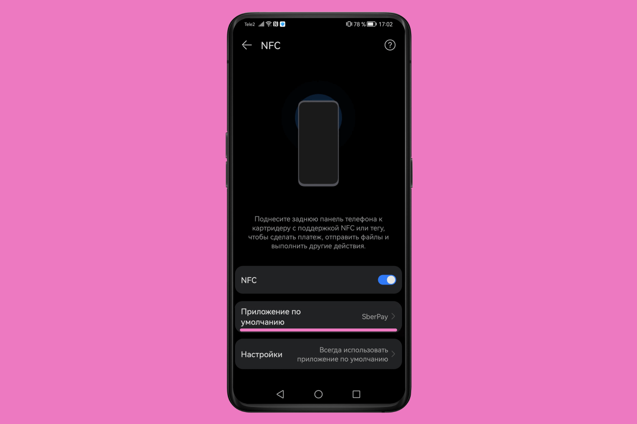 Найдите в настройках вашего смартфона вкладку NFC. Необходимая настройка находится в этом разделе, может называться «Приложение по умолчанию» или «Бесконтактные платежи». Вам потребуется снять галочку с Google Pay и установить ее на SberPay.
