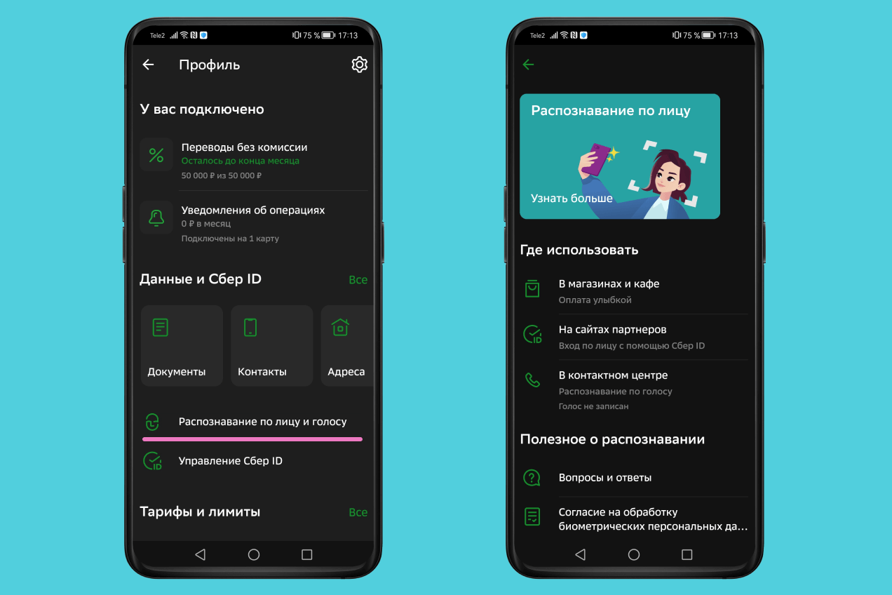 Чтобы настроить оплату покупок улыбкой, откройте приложение «Сбербанк Онлайн», найдите иконку человека в левом верхнем углу. Это будет ваш профиль. Перейдите в профиль и кликните «Распознавание по лицу и голосу». Остается только выбрать карту, с которой вы хотите платить. Перейдите в «Настройки» и кликните «Оплата улыбкой».