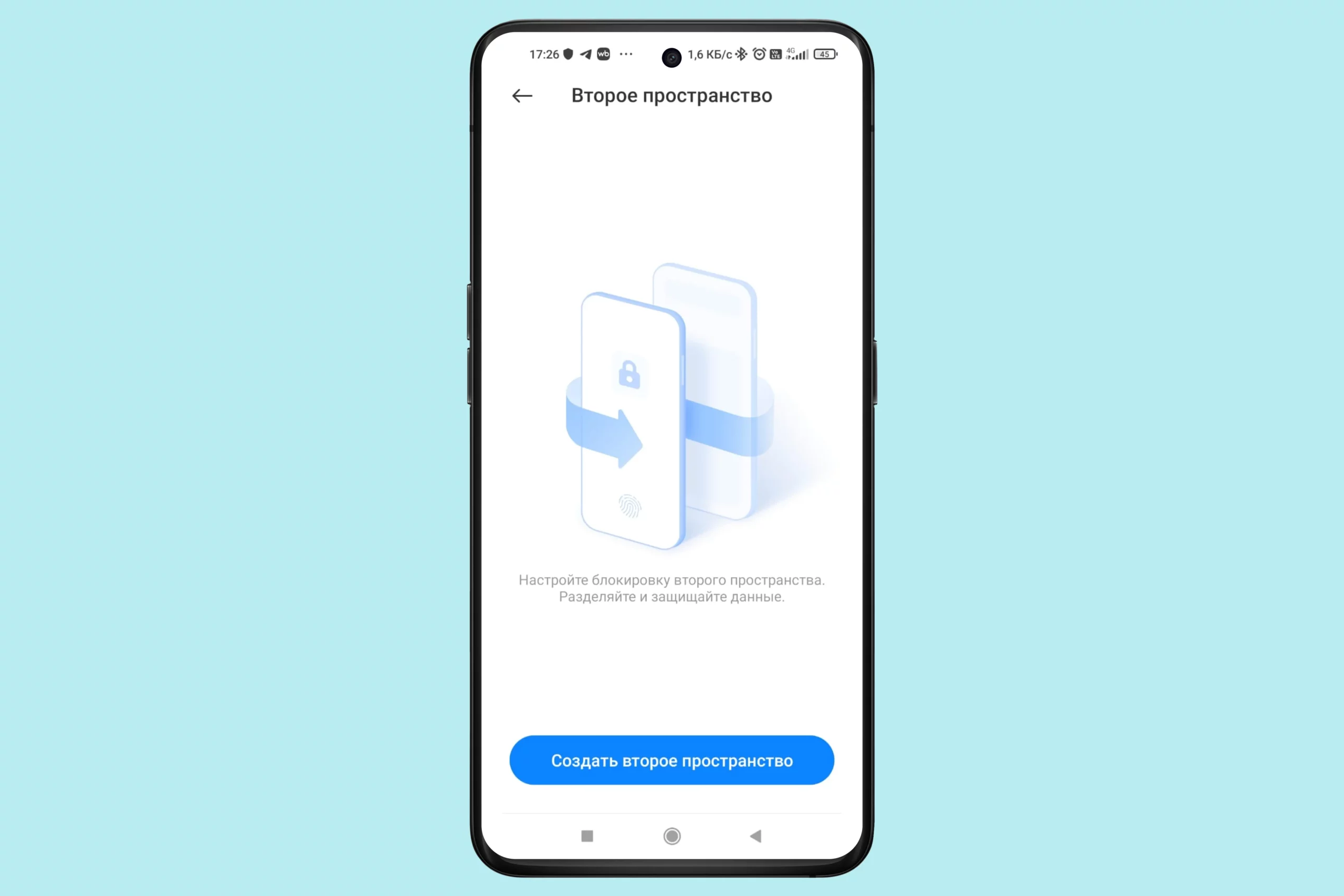 - Нажмите «Создать второе пространство» и следуйте инструкции. Вам предложат задать графический ключ для защиты второго пространства.