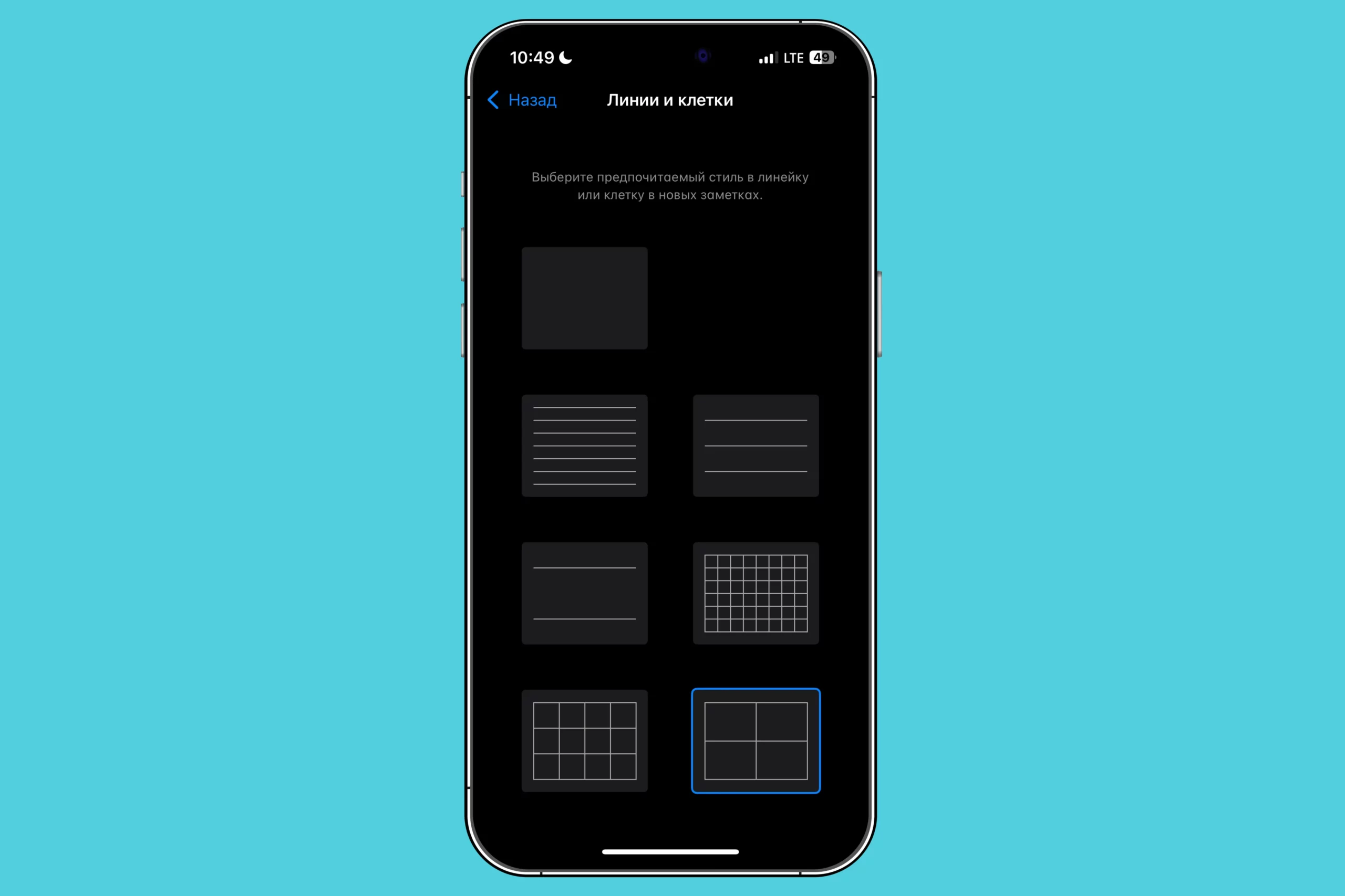 Также в «Заметках» можно менять фон документа. Вместо черного или белого доступны и другие варианты: разные виды линий и клеток.