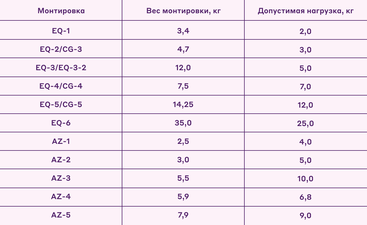 Что касается монтировки, то здесь важна ее грузоподъемность, а также вес, если планируете выезжать с оборудованием за город. Эти параметры приведены в таблице: