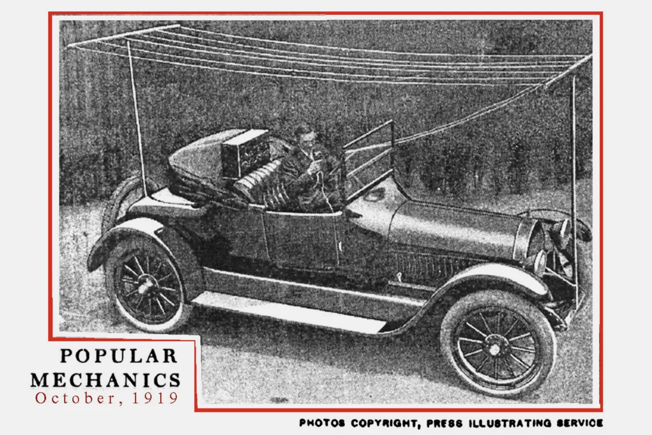 Так выглядела антенна прототипа раннего автомобильного радиоприемника. Отлично подходит, чтобы сушить белье или привлекать некрупных птиц, не правда ли? В салоне хранился массивный ящик с хрупкими вакуумными лампами — собственно радиоприемник. Антенну, впрочем, удалось быстро уменьшить, убрав почти полностью внутрь салона. А вот компактный радиоприемник, способный пережить тряску на ухабах, собрали только в 1928-м, назвав Motorola 5T71.