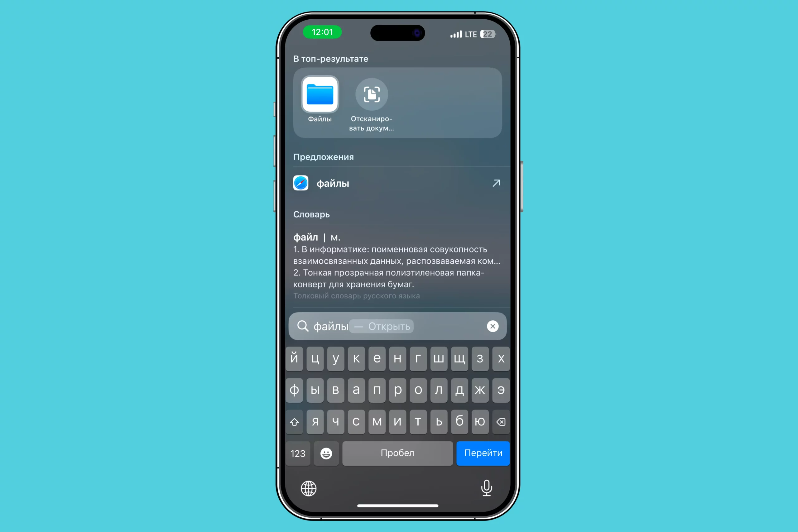 Может случиться так, что у вас не получится найти «Файлы» ни на главном экране «Домой», ни в библиотеке со всеми программами. Тогда проведите пальцем вниз от центра главного экрана, введите «Файлы» в поле поиска — и айфоновский «Проводник» высветится в блоке «Приложения» или в топ-результатах.