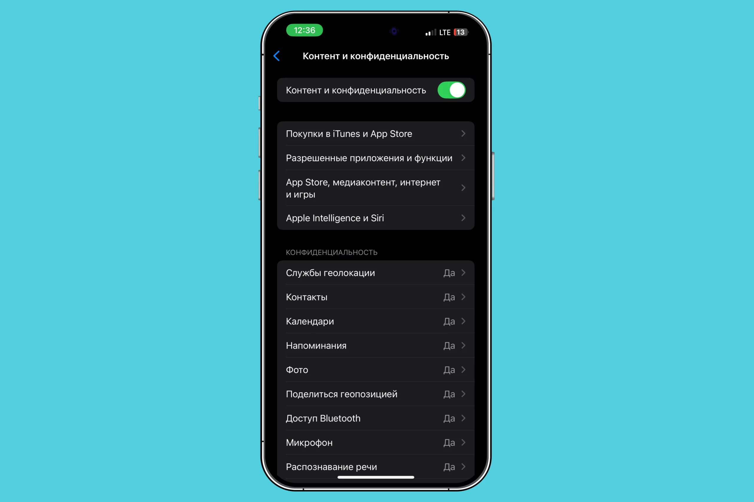 - Если все пункты серые и на них нельзя нажать, кликните на слайдер возле пункта «Контент и конфиденциальность».