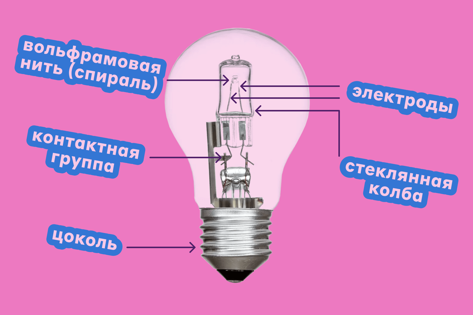 Наиболее бюджетный, простой и проверенный временем вариант, лампа накаливания, состоит из цоколя и стеклянной колбы, внутри которой расположена вольфрамовая нить и электроды. Свечение происходит за счет тока, который проходит через вольфрамовую нить, накаляя ее. Воздух из колбы откачан — вместо него она обычно заполняется газом (чаще всего аргоном). Делается это для того, чтобы продлить срок службы лампочки и предотвратить окисление вольфрама.