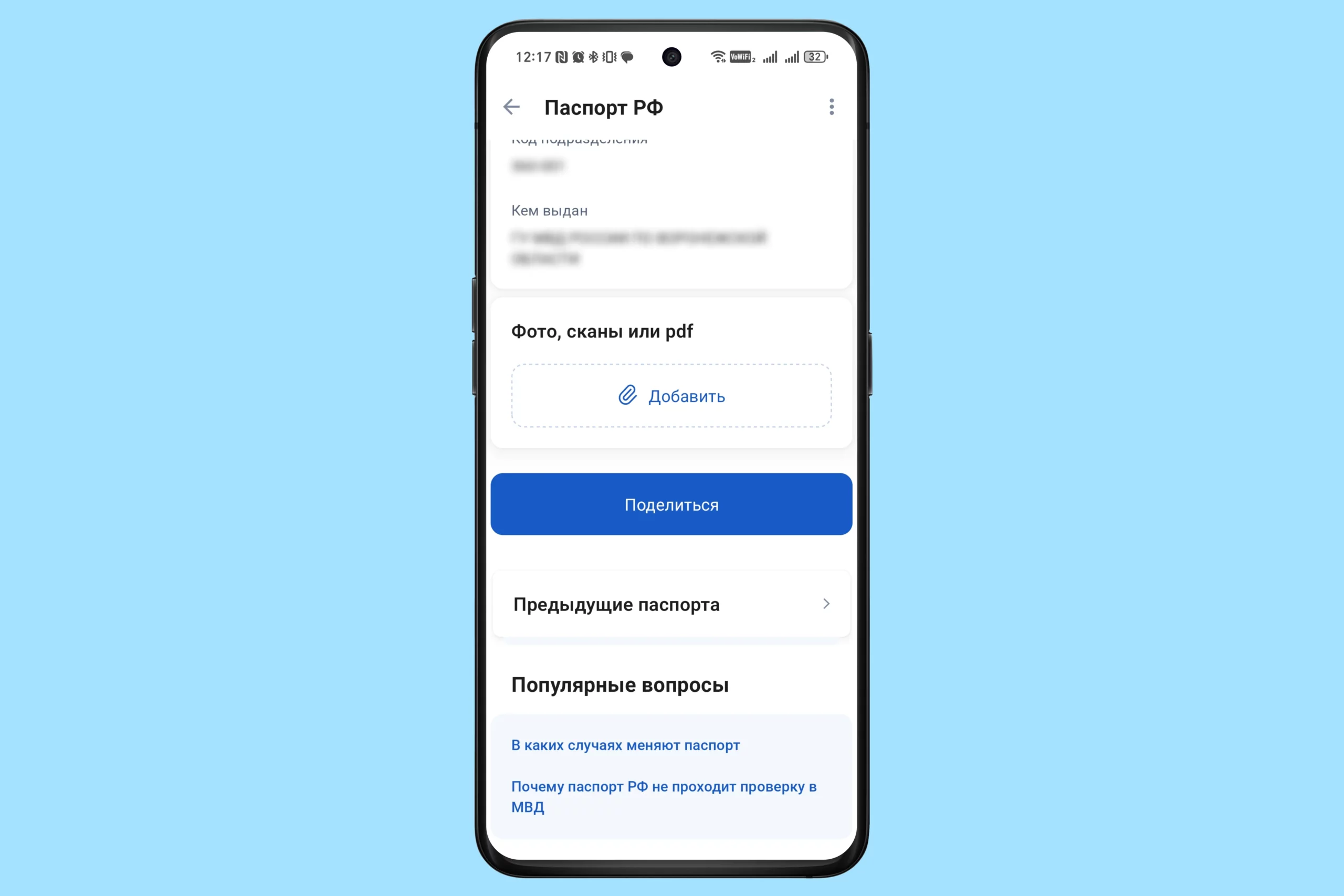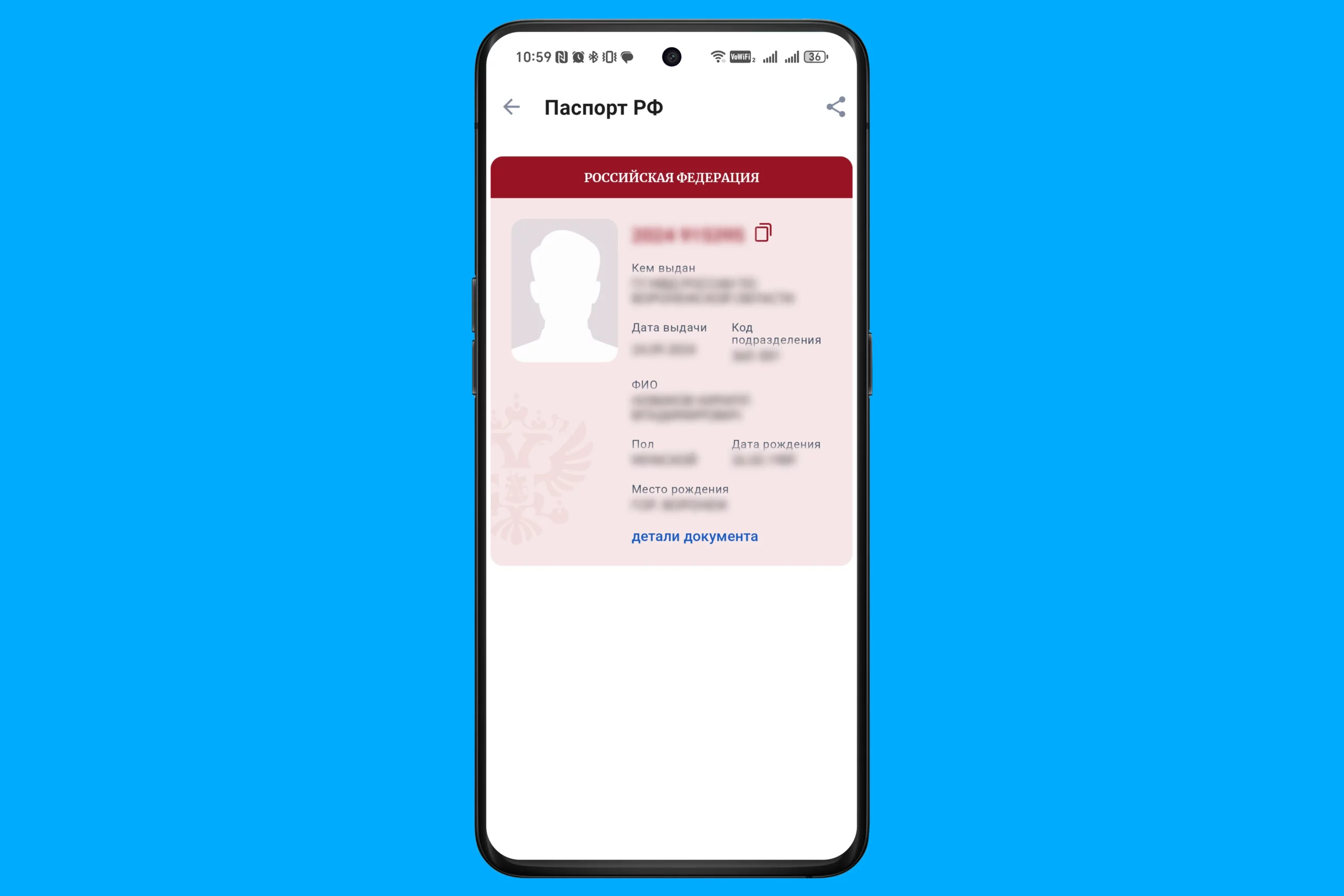 2. Загрузите данные паспорта. Если не сделали этого раньше, перейдите в раздел «Документы» и выберите «Паспорта». Нажмите на кнопку «Детали документа» и добавьте данные своего бумажного документа.