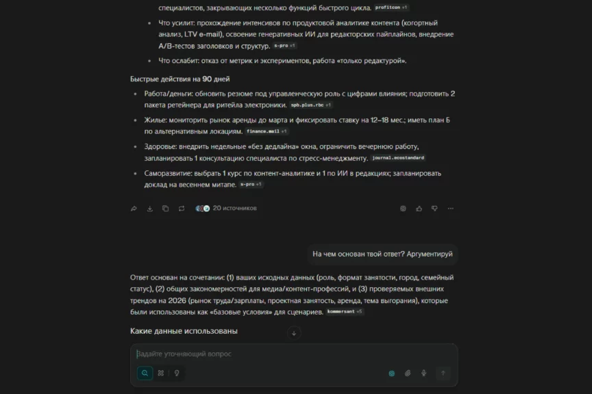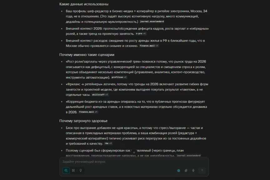 Обоснование в целом логичное: модель отталкивается от вашего профиля и добавляет внешний контекст как набор условий. Но без дополнительных вводных некоторые ответы неизбежно остаются очень обобщенными, а не персонализированными.