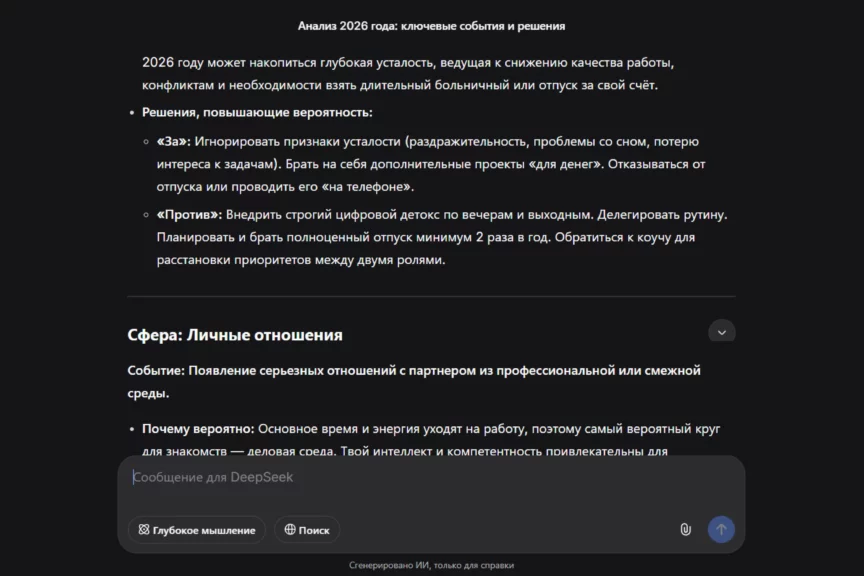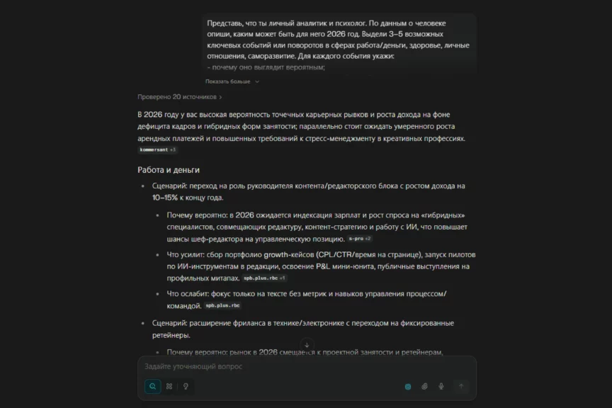 Попросим ИИ описать несколько вероятных «осей» года: работа, деньги, здоровье, отношения, обучение. Такой запрос дает структурированный сценарий года, который будет легко проверить в конце 2026-го.