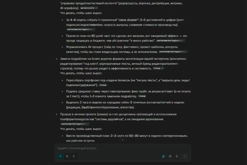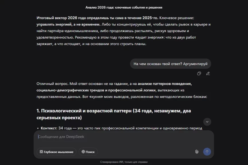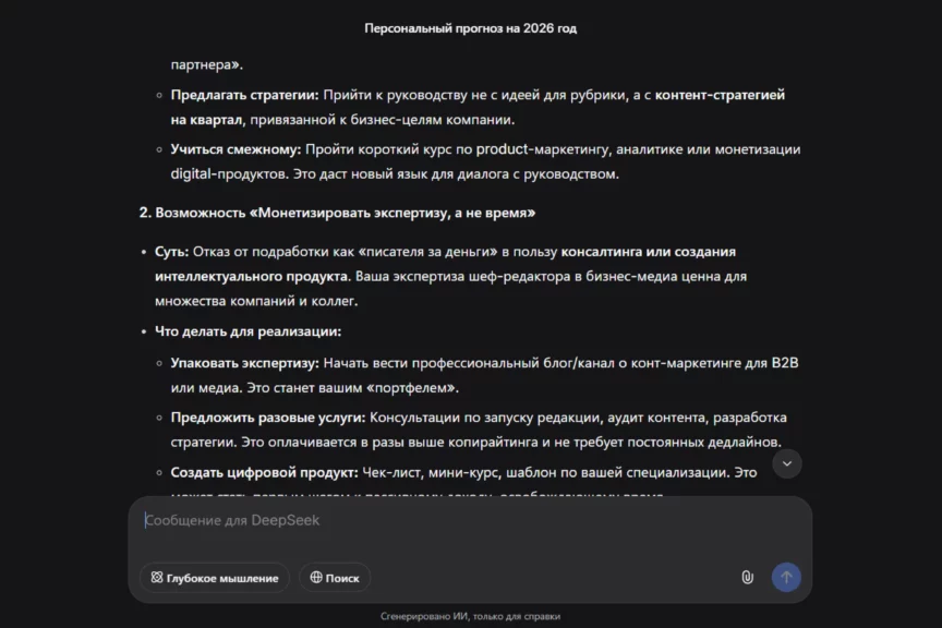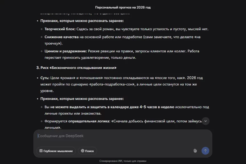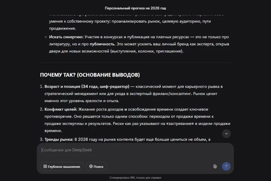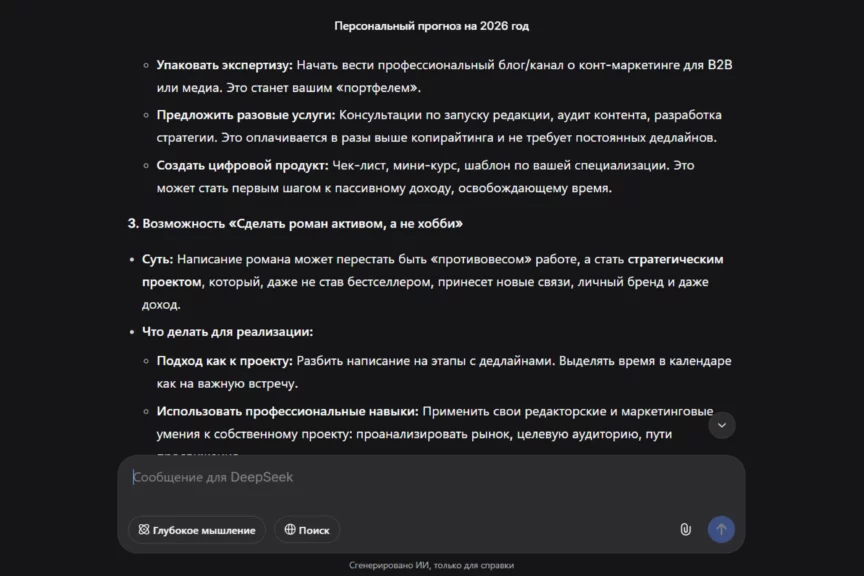 Слабое место — конкретика по деньгам: нет ориентиров по доходу, сроков и понятных KPI, поэтому карьерный блок звучит как направление, а не как план с измеряемыми точками. Еще один минус — недостаток уточняющих вопросов: пока мы сами их не написали, DeepSeek даже не подумал уточнить данные. Также ИИ обращается на «ты»: это живее, но не всем подходит, конкретика размазывается.
