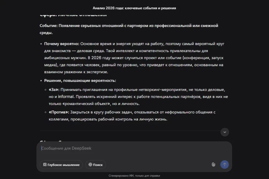 3. Прогноз о конкретных отношениях. Не «будет ли любовь», а, например: «как изменятся отношения с работой», «как изменится отношение к деньгам», «как изменится забота о себе». Это позволяет ИИ глубже копнуть мотивацию и паттерны поведения.